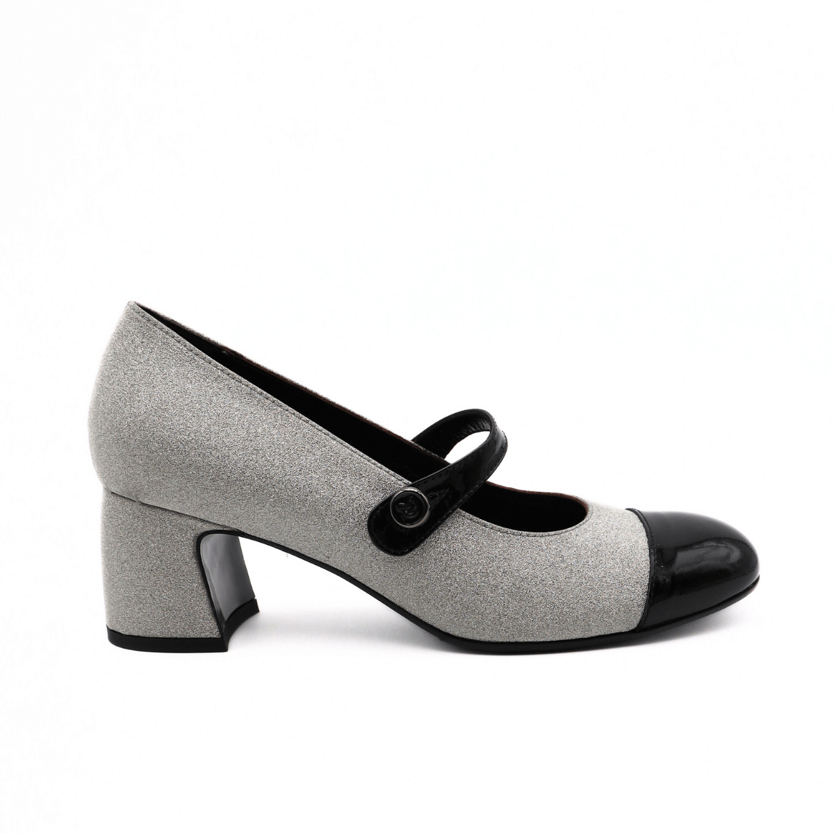 Decollete da donna di CINZIA VALLE, realizzata in pelle brillantinata argento con punta verniciata nera e cinturino regolabile alla caviglia. Interno e sottopiede, morbido, rivestita in pelle. Suola in gomma e cuoio con tacco 5,5 cm.