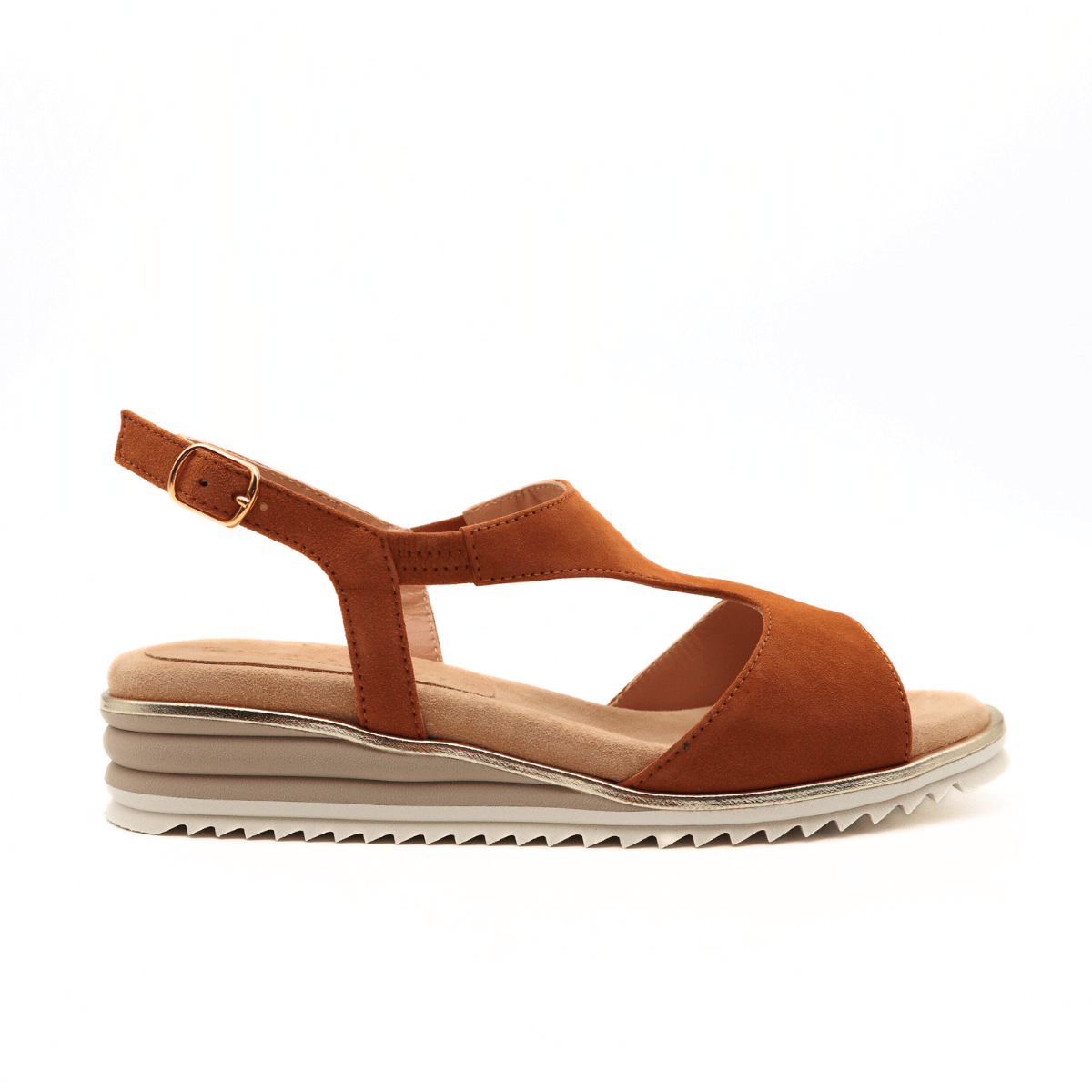 Sandalo da donna CINZIA VALLE. Tomaia realizzata in pelle scamosciata cuoio con cinturino regolabile. Interno e sottopiede, non estraibile, foderato in pelle. Suola con zeppa bicolore in gomma. (Altezza: 3 cm)