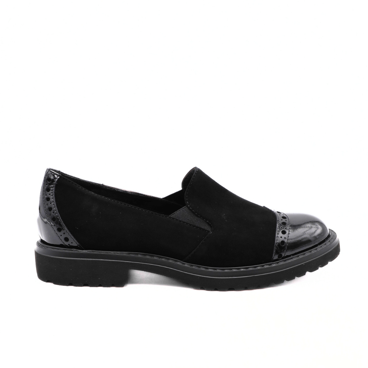 Slipon da donna di CINZIA VALLE, realizzata in camoscio nero con punta verniciata e elastici laterali. Interno e sottopiede, morbido, rivestita in pelle. Suola in gomma.