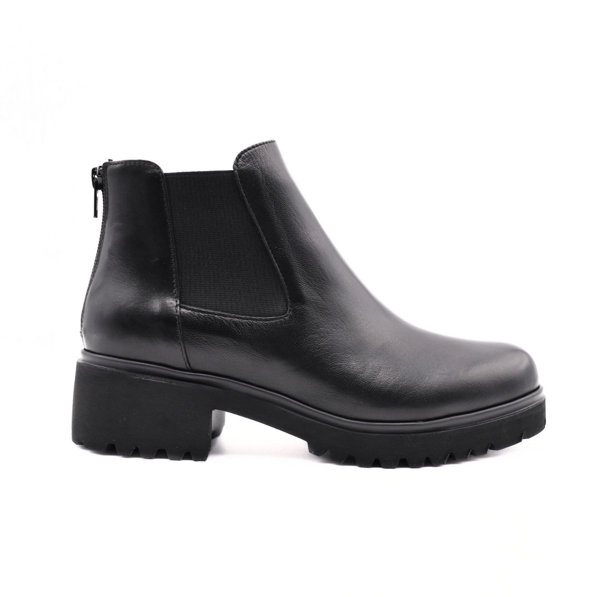 Stivaletto da donna di CINZIA VALLE, realizzata in pelle neppa nera con zip sul tallone ed elastici laterali. Interno e sottopiede, morbido, rivestita in pelle. Suola in gomma carrarmato (altezza 4cm).