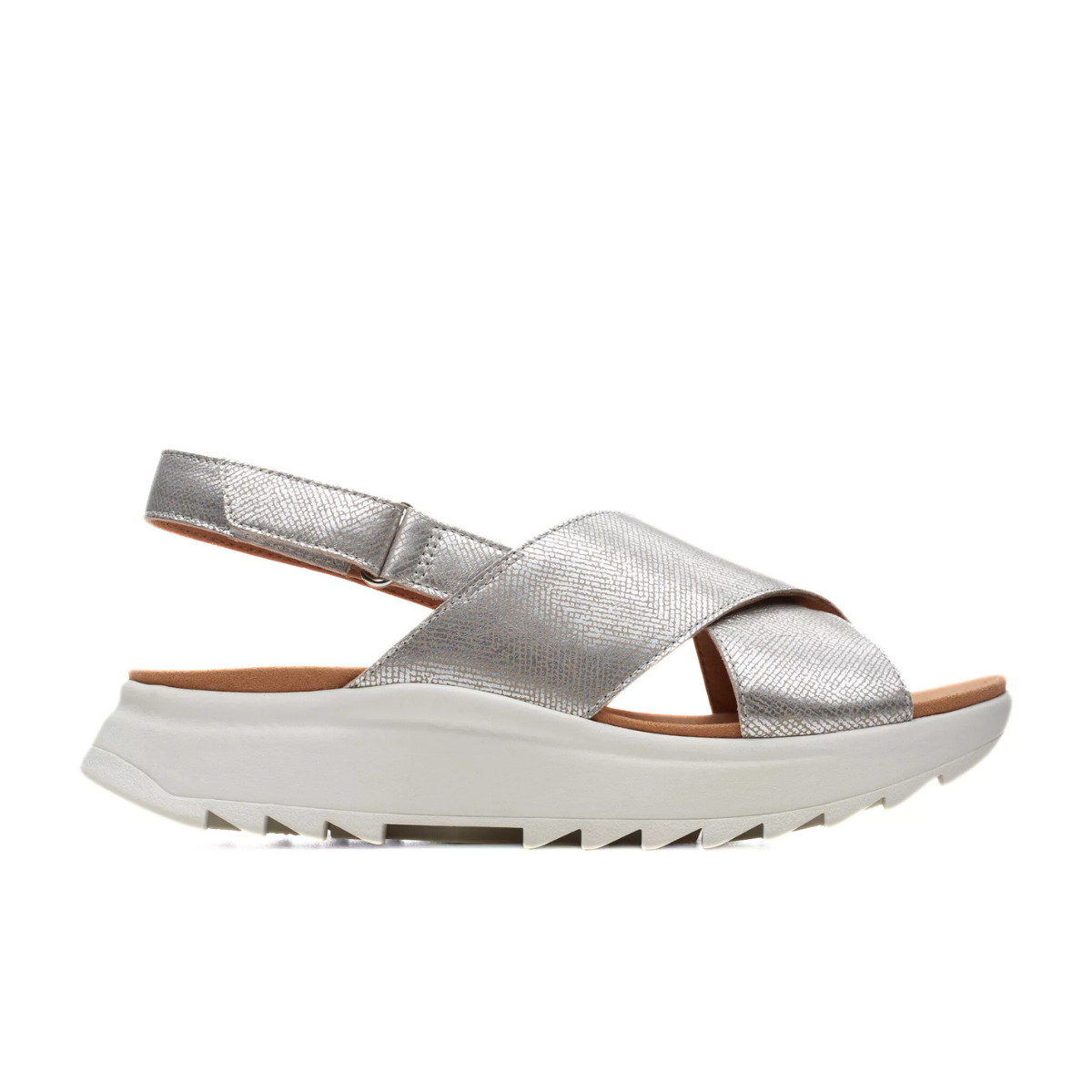 Sandalo zeppa, da donna, di CLARKS. Realizzato in pelle effetto squamato argento, con intreccio frontale. Chiusura con cinturino a strappo. Interno e sottopiede foderati in tessuto. Suola in gomma (4cm).