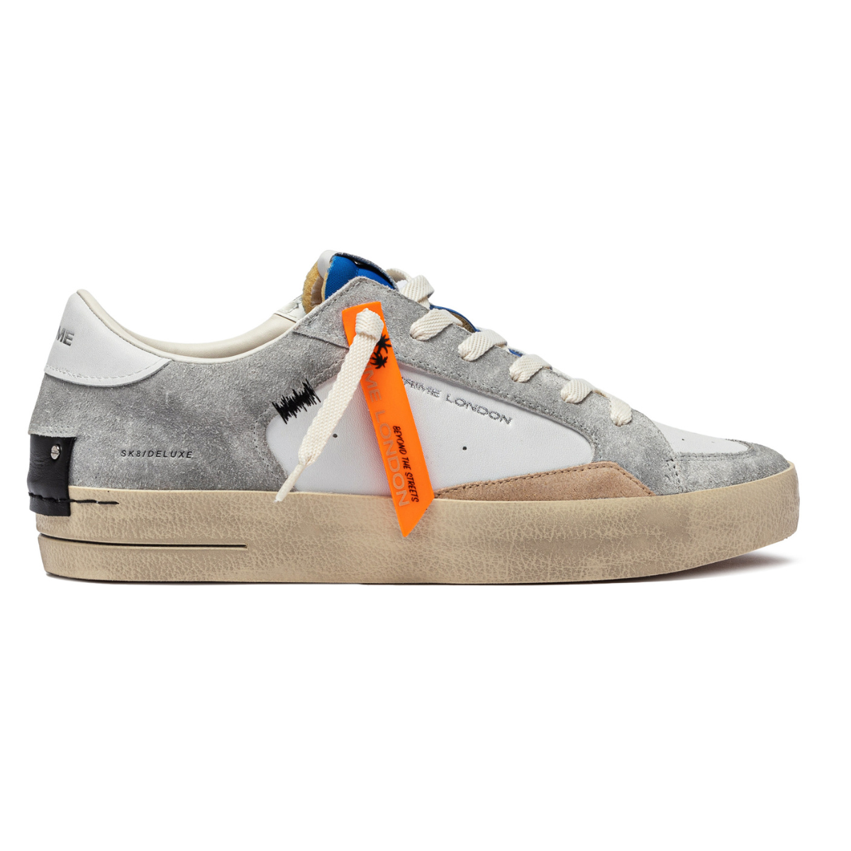 Sneakers di CRIME LONDON realizzate in pelle bianca con inserti in camoscio nelle tonalità del grigio e del beige. Interno foderato in tessuto e pelle. Sottopiede estraibile, in pelle. Chiusura con laccio. Suola in gomma.