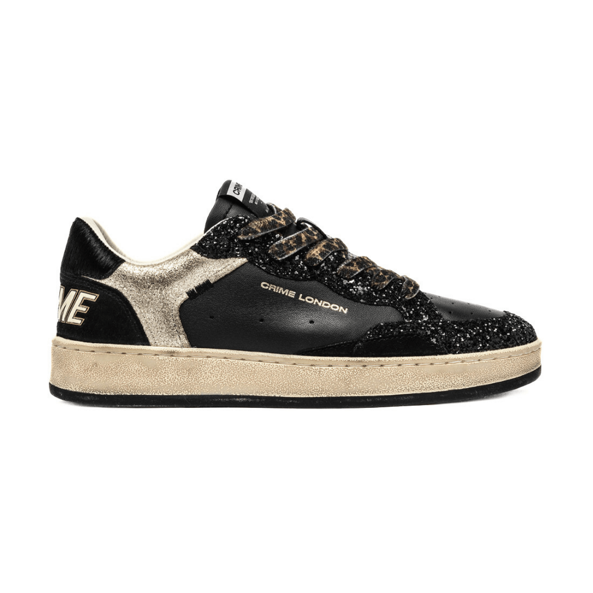 Realizzate in pelle nera con inserti glitter neri e talloncino in cavallino nero. Tallone in suede nero con logo CRIME. Inserto in suede spalmato oro. Fodera in pelle e tessuto.