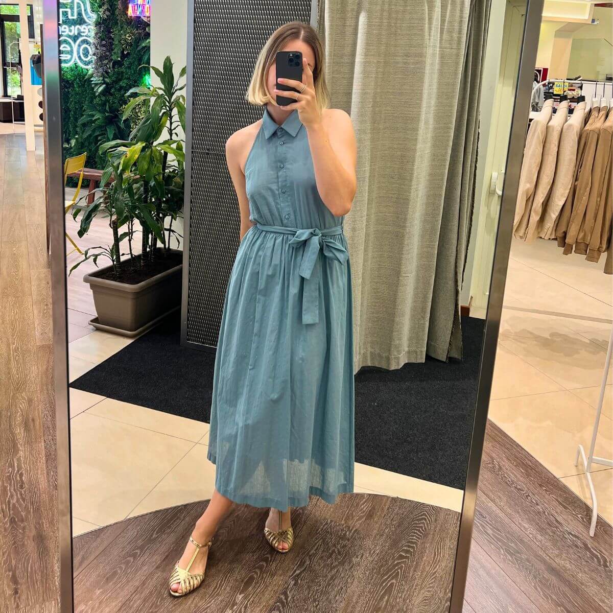 Abito chemisier di CROCHÈ, color celeste con sottili righe verticali oro, realizzato al 97% in cotone e al 3% in poliestere. Presenta un'ampia scollatura sul retro e la vita elasticizzata, con fascia regolabile in tono. Chiusura con bottoncini e colletto. La gonna dispone di una fodera.