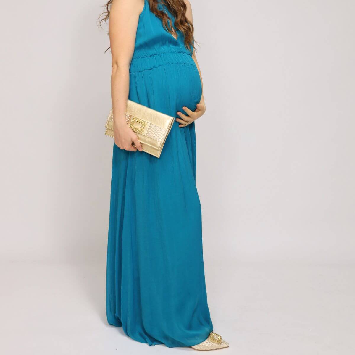 Vestito lungo da donna di CROCHÈ realizzato in tessuto color smeraldo con spalline fine e arricciatura in vita.