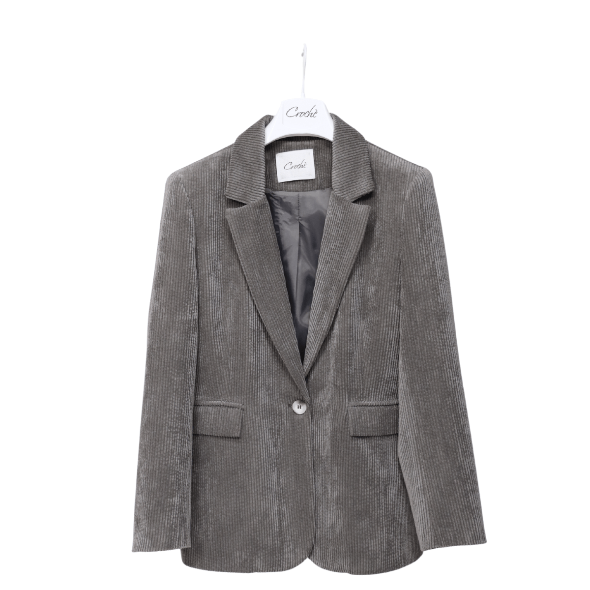Giacca di CROCHÈ dal taglio sartoriale, realizzata in tessuto effetto velluto a costine. Composizione: 88% poliestere, 11% poliammide, 1% elastane. Vestibilità regolare.