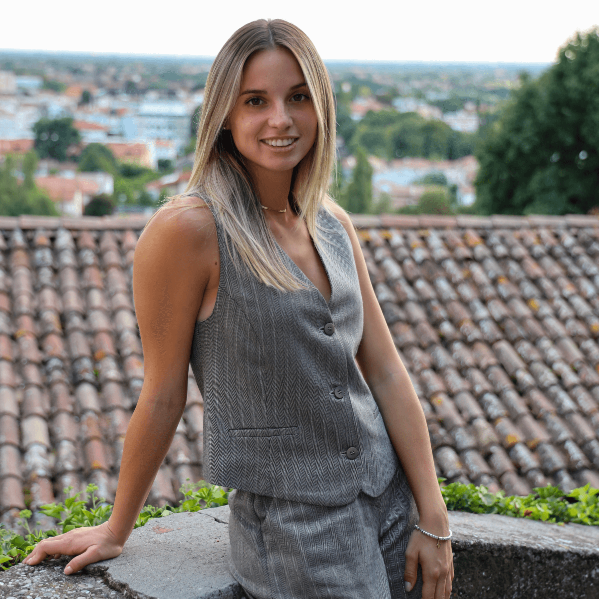 Gilet di CROCHÈ , realizzata in tessuto grigio a spina di pesce con fili in lurex. Chiusura con bottoni. La modella indossa una S.