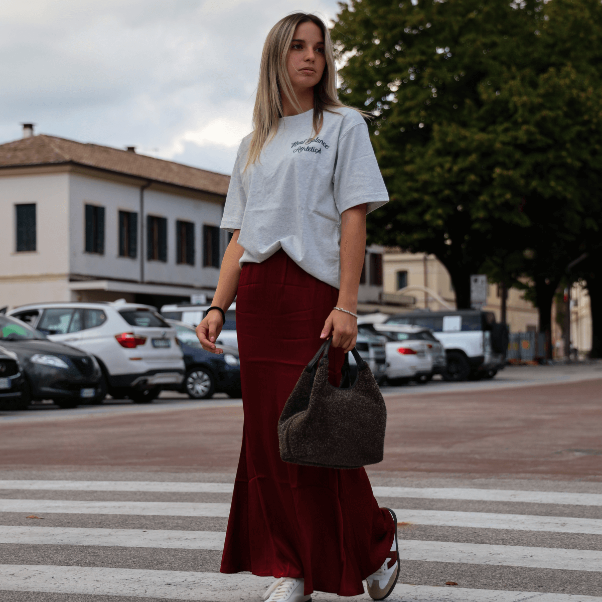 Gonna lunga da donna di CROCHÈ, realizzata in tessuto effetto raso bordeaux con elastico in vita. Vestibilità regolare, la modella indossa una S.