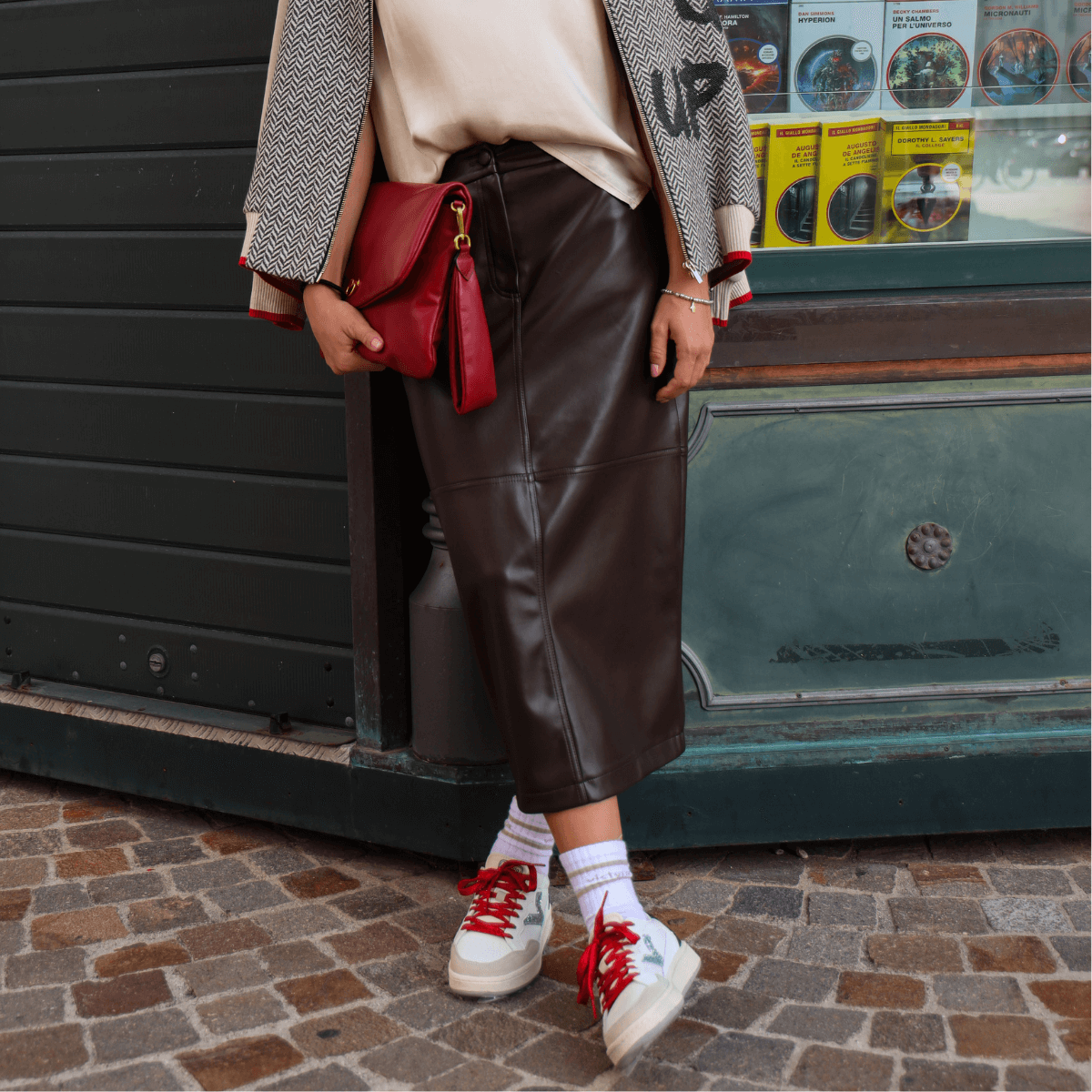 Gonna longuette di CROCHÈ, realizzata in similpelle color cioccolato. Vestibilità regolare, la modella indossa una S.