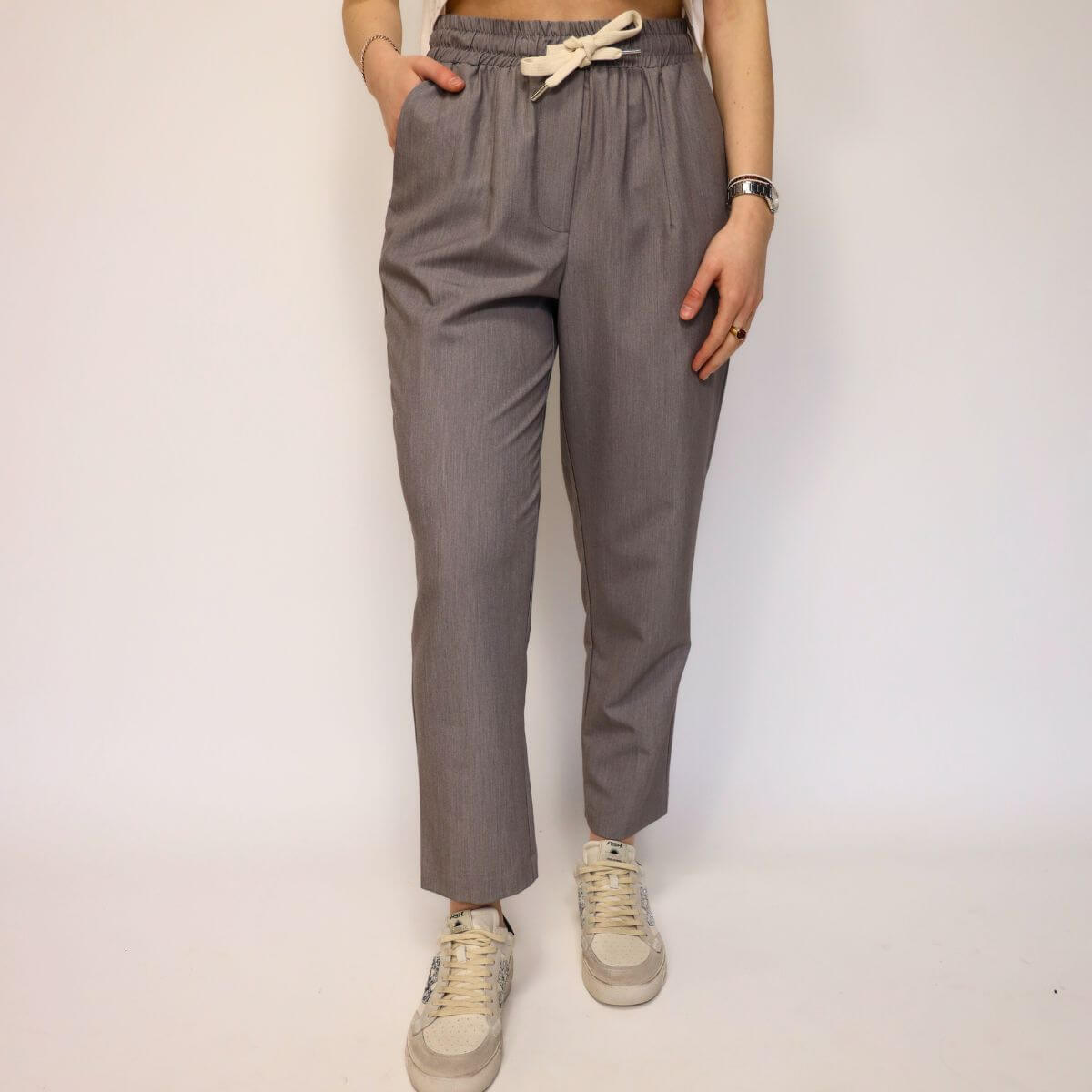 Pantalone leggero da donna di CROCHÈ, realizzato in tessuto grigio con chiusura con elastico e couliss. La modella è alta 1.68 cm e veste un M.