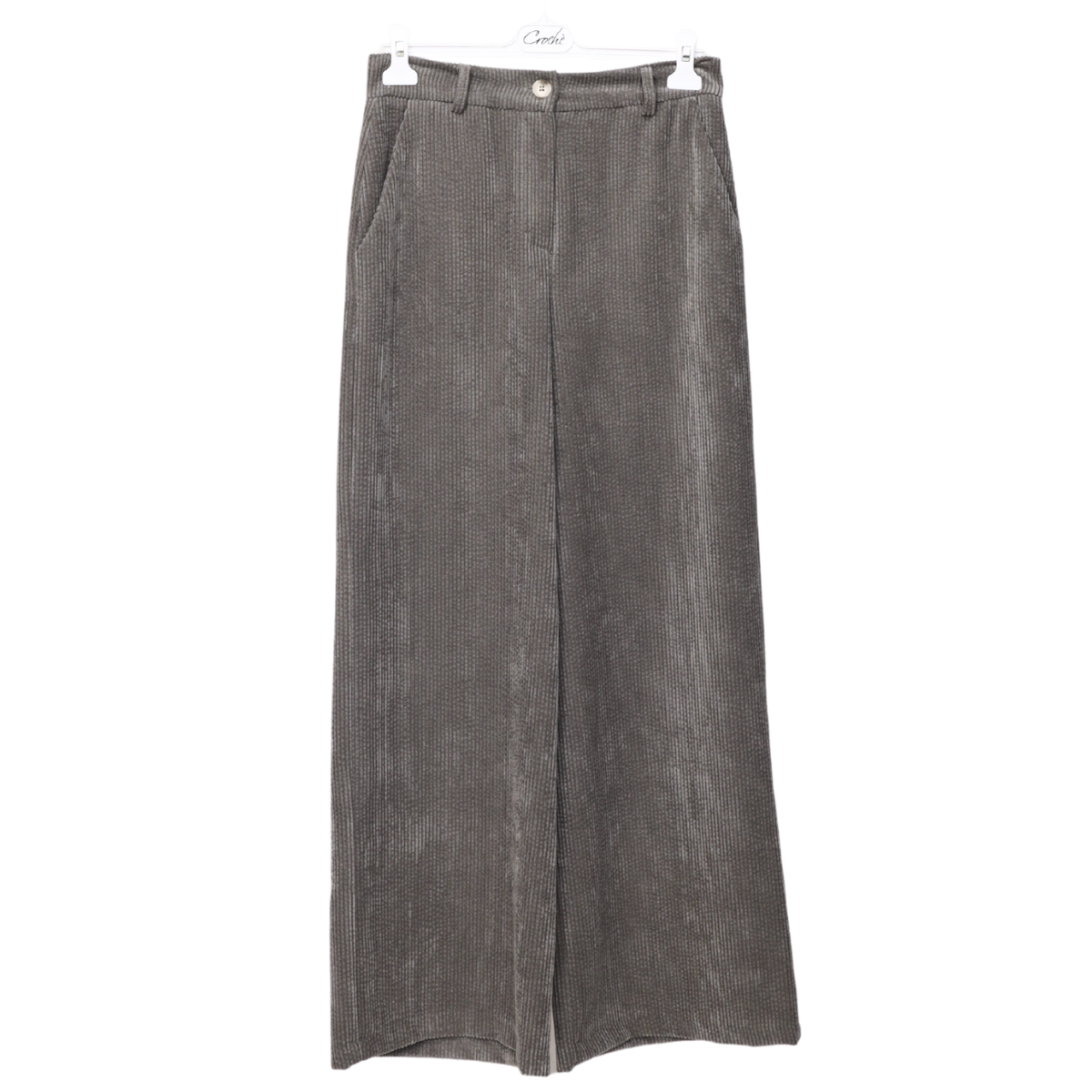 Pantalone di CROCHÈ dal taglio sartoriale, a palazzo, realizzato in tessuto effetto velluto a costine. Presenta due tasche frontali regolari e due taschine finte sul retro. Dotato di passanti. Composizione: 88% poliestere, 11% poliammide, 1% elastane. Vestibilità regolare.