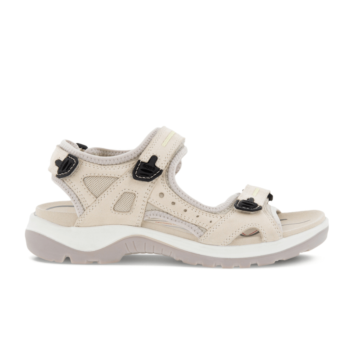 Sandalo donna di ECCO, realizzato in pelle nabuk ingrassato color bianco panna con tessuto tecnico elasticizzato nella fodera. Larghezza regolabile con strappi, sottopiede sagomato con zone a densità diversa. Suola in gomma con tecnologia RECEPTOR™ che garantisce un ottimo supporto al piede nelle fasi di appoggio e stacco.