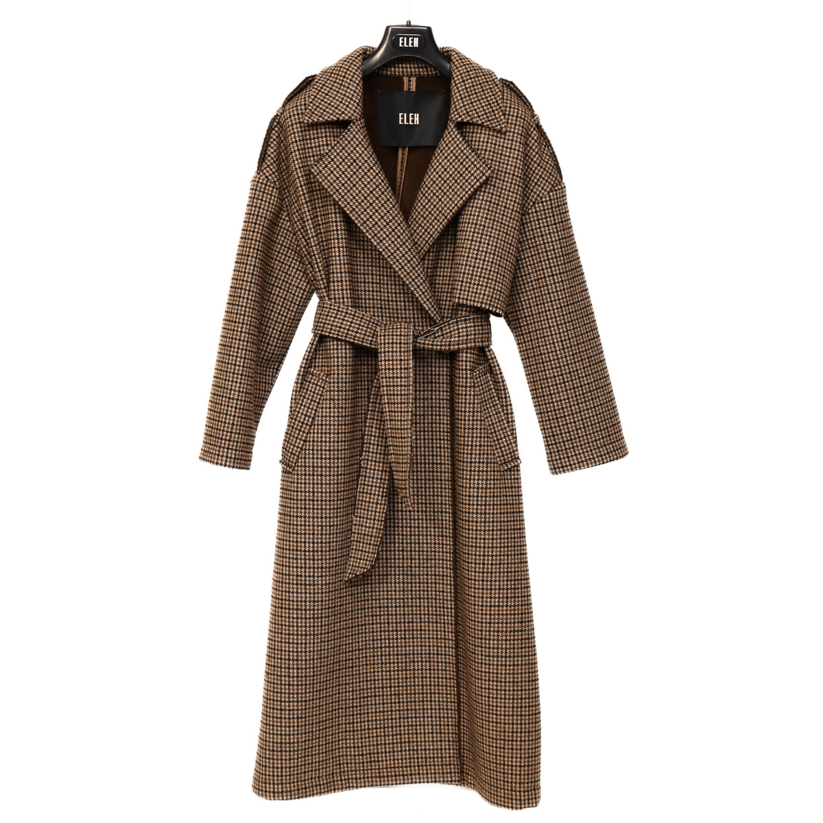 Cappotto di ELEH con stampa quadrettata sui toni del marrone.
