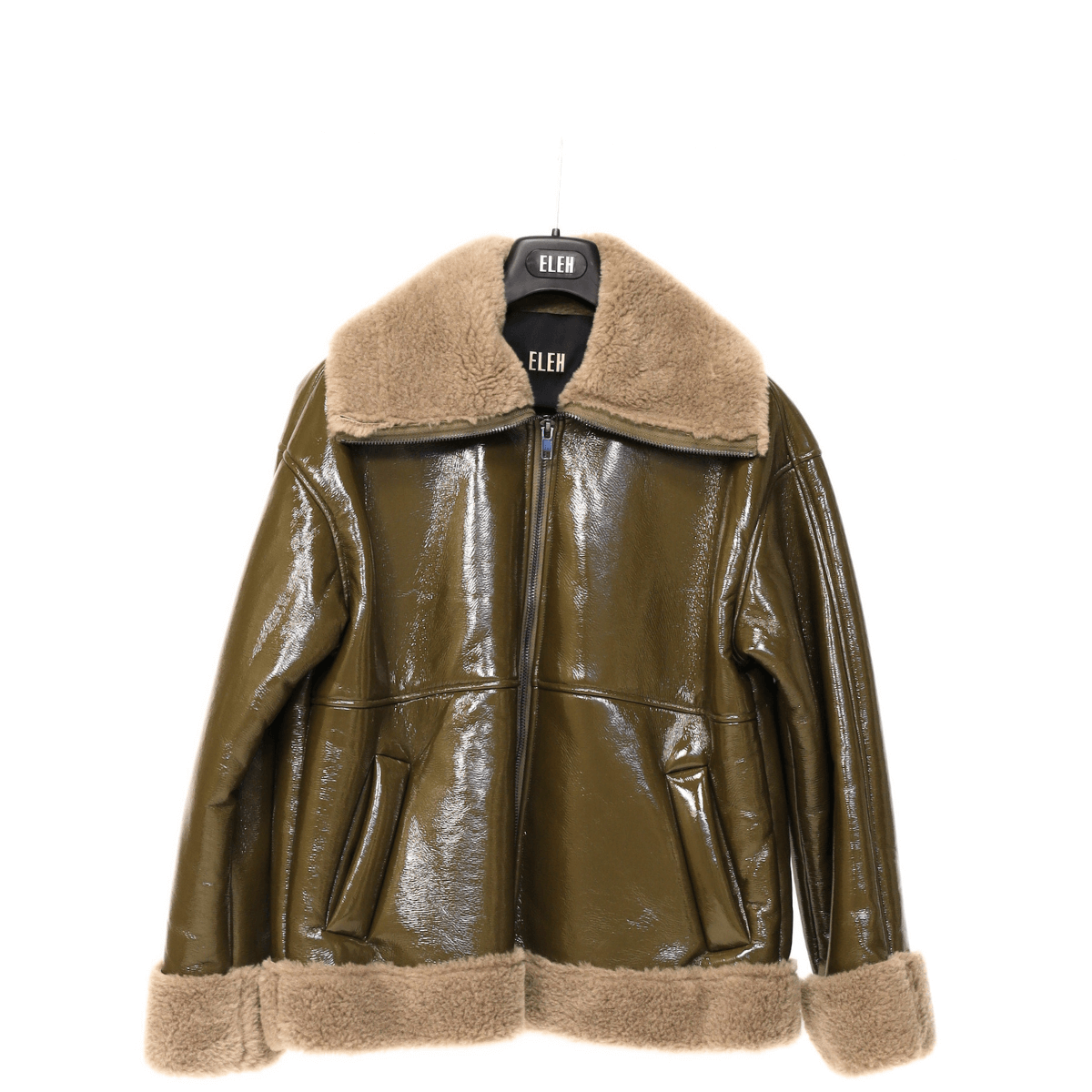 Montone di ELEH in ecopelle effetto naplak dal finish lucido e sofisticato, in una ricercata tonalità di verde kaki. L’interno è completamente foderato in ecopelliccia, presente anche su collo e polsini, per un look caldo e avvolgente.