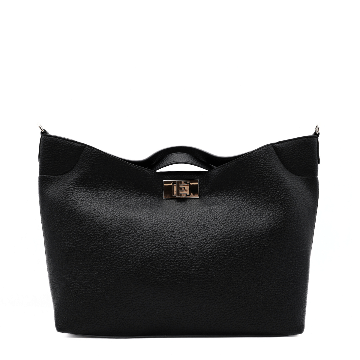 Borsa, modello RACHELE, di ERMANNO SCERVINO realizzata in morbida ecopelle bottalata nera. Portabilità a mano. Chiusura a incastro e unico comparto interno. Logo argento e tracolla regolabile e removibile.