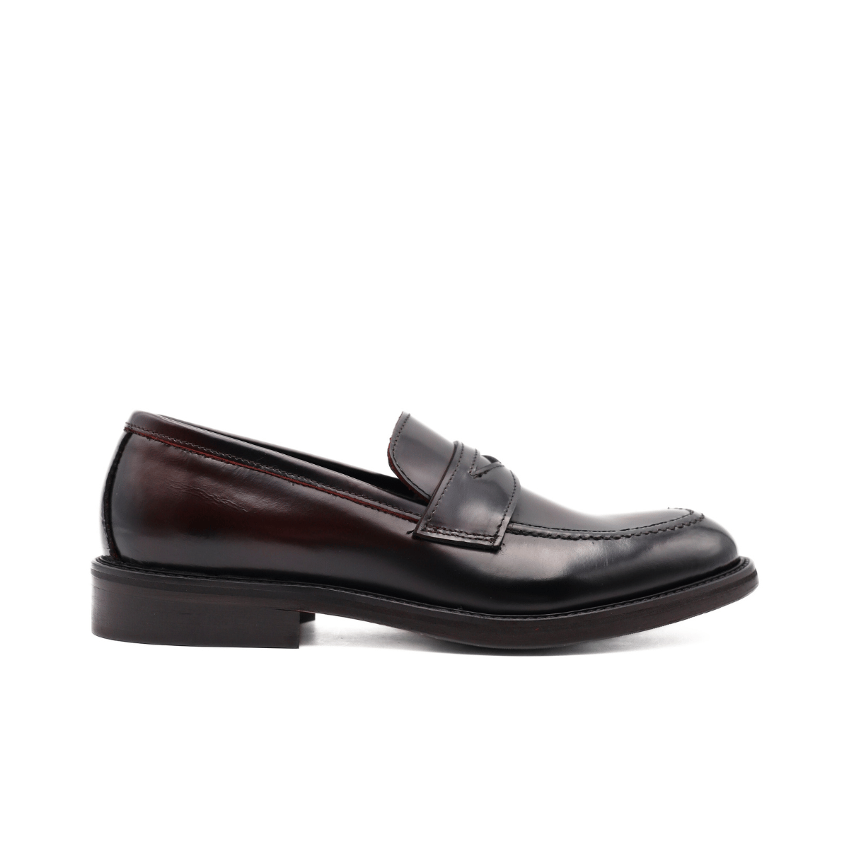 Mocassino di F.LLI RENNELLA realizzato in pelle spazzolata di colore bordeaux con morsetto frontale e cuciture a vista.