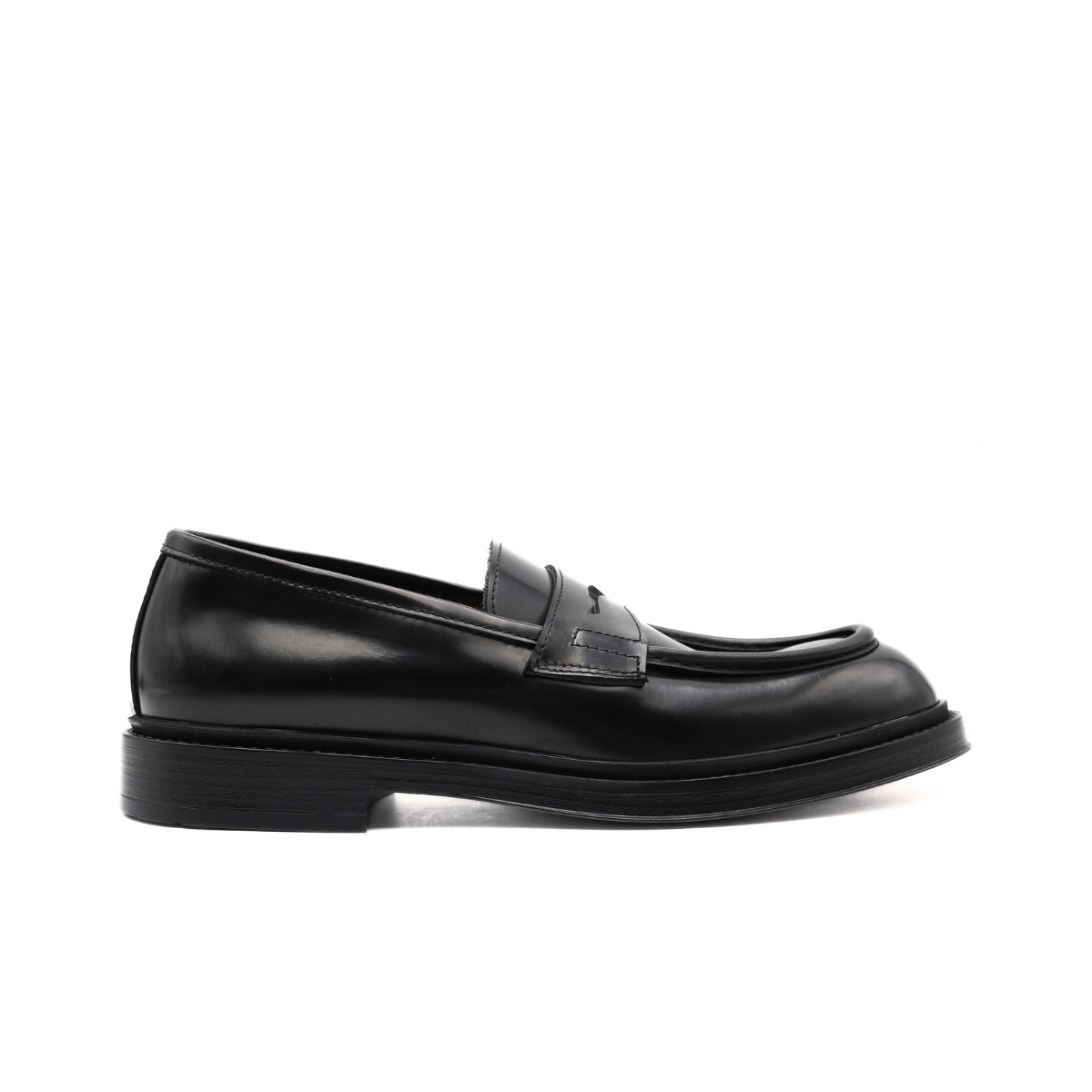 Mocassino di F.LLI RENNELLA realizzato in pelle spazzolata di colore nero con morsetto frontale e cuciture a vista.