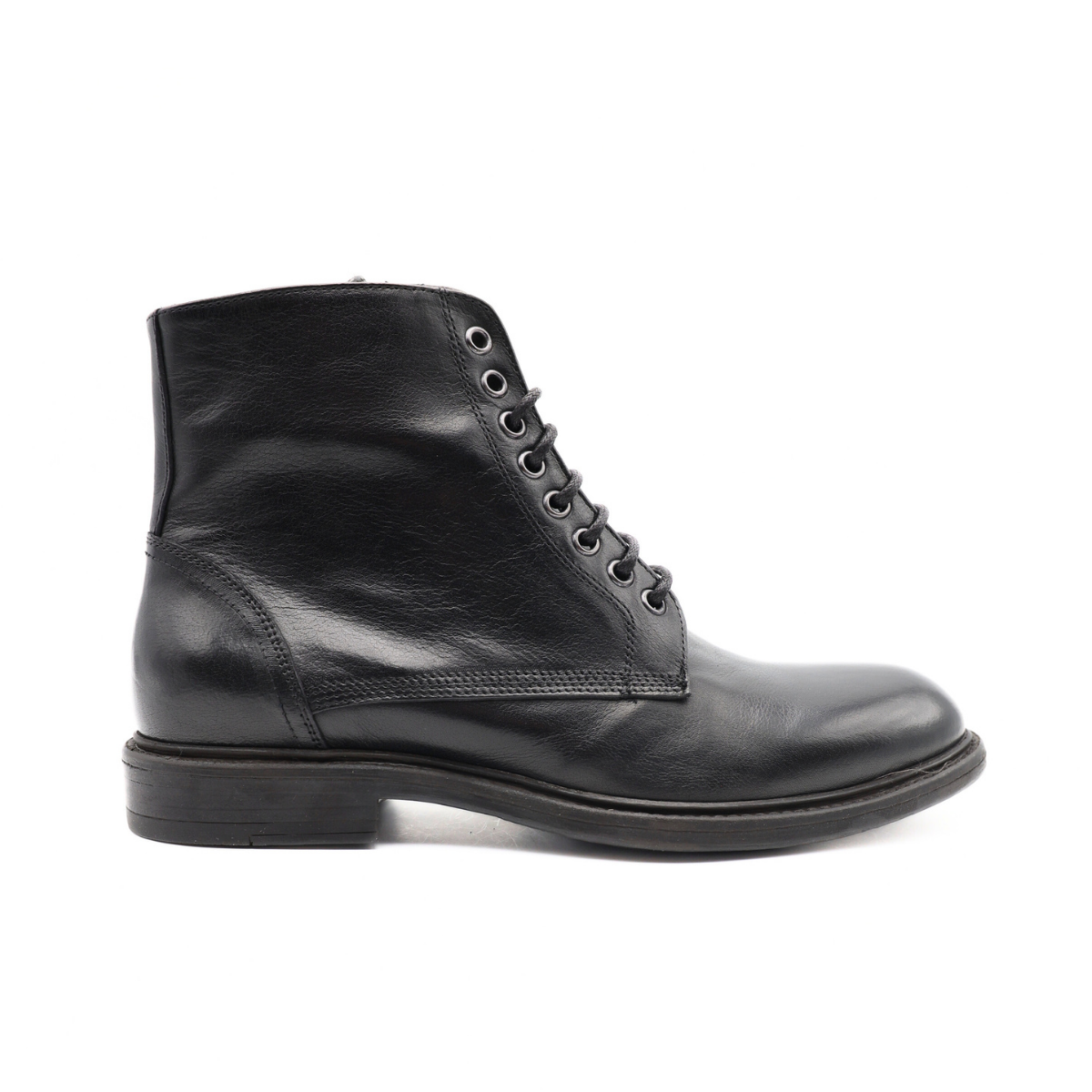 Anfibio uomo di FRANCO FEDELE. Tomaia in pelle nera, con cuciture a vista, internamente foderata, e nel sottopiede in pelle. Suola in gomma, tacco esterno 2.5 cm. Chiusura con laccio fino.