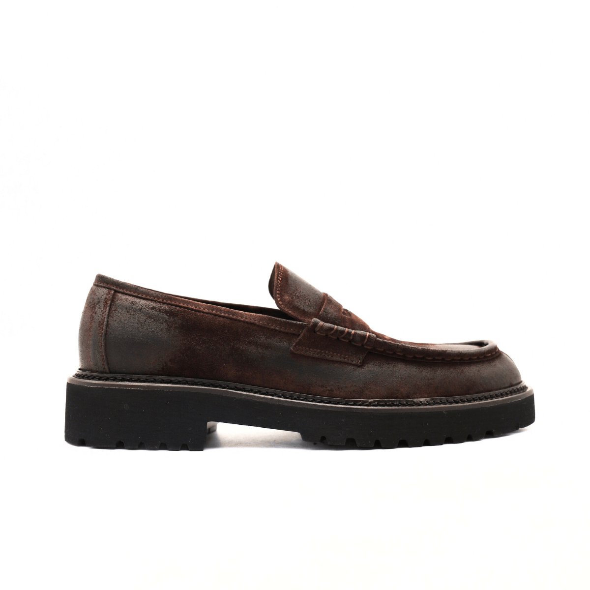 Mocassino da uomo di FRANCO FEDELE. Tomaia in pelle bruciata color testa di moro, decorata con cuciture a vista. Internamente foderata e sottopiede in pelle. Suola in gomma