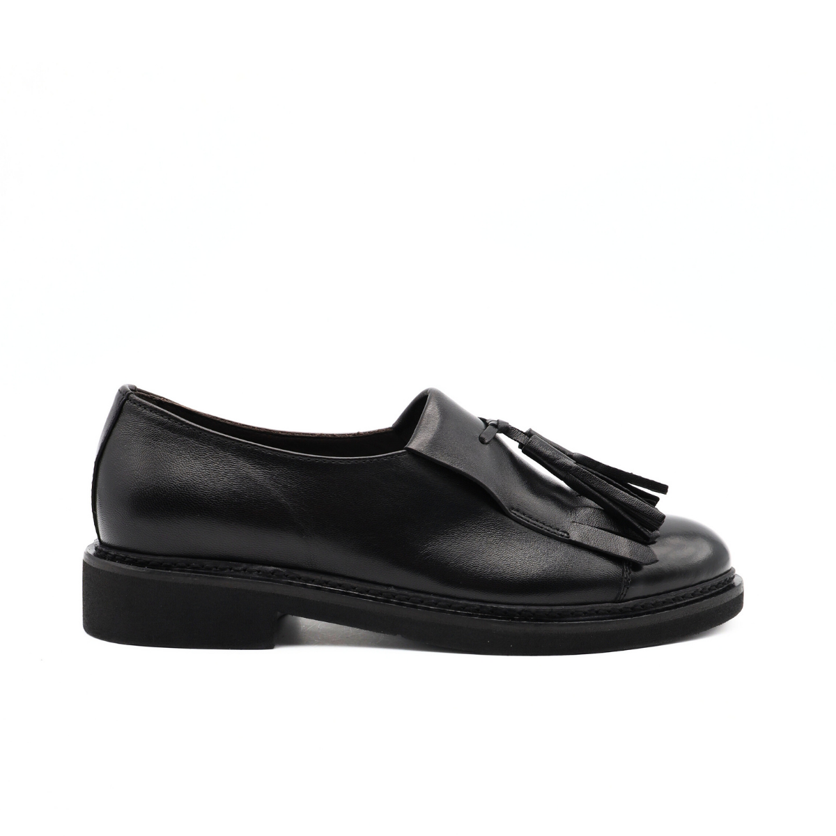 Mocassino da donna di FRANCO FEDELE. Tomaia in pelle nera, decorata con frangia. Internamente foderata e sottopiede in pelle. Suola in gomma extralight, tacco esterno 2.5 cm.