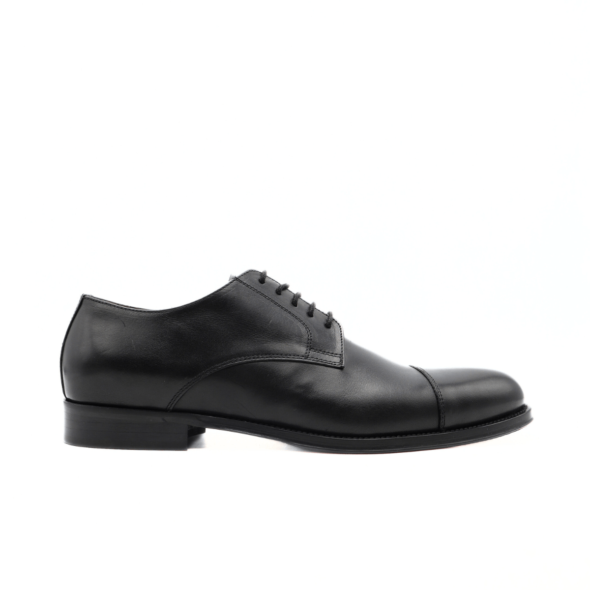 Stringata da uomo di FRANCO FEDELE. Tomaia in pelle nera decorata con cuciture a vista. Internamente foderata e sottopiede in pelle. Suola in gomma e cuoio.