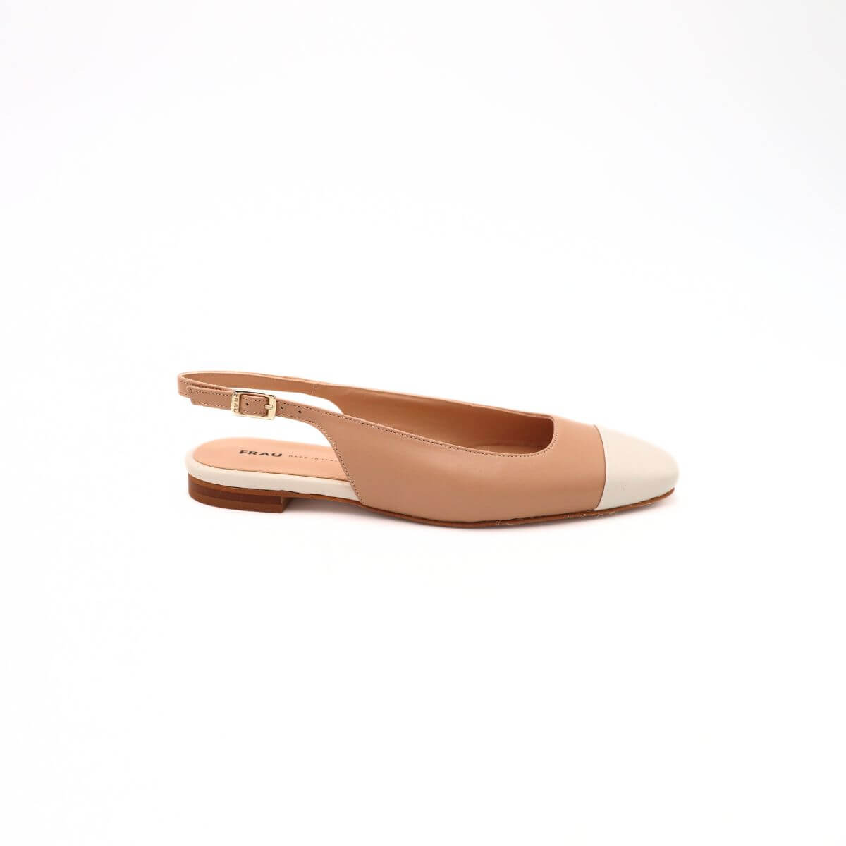 Slingback da donna di FRAU, realizzata in pelle nude con punta in contrasto burro. Interno e sottopiede rivestito in pelle. Suola in gomma. Chiusura con cinturino regolabile.