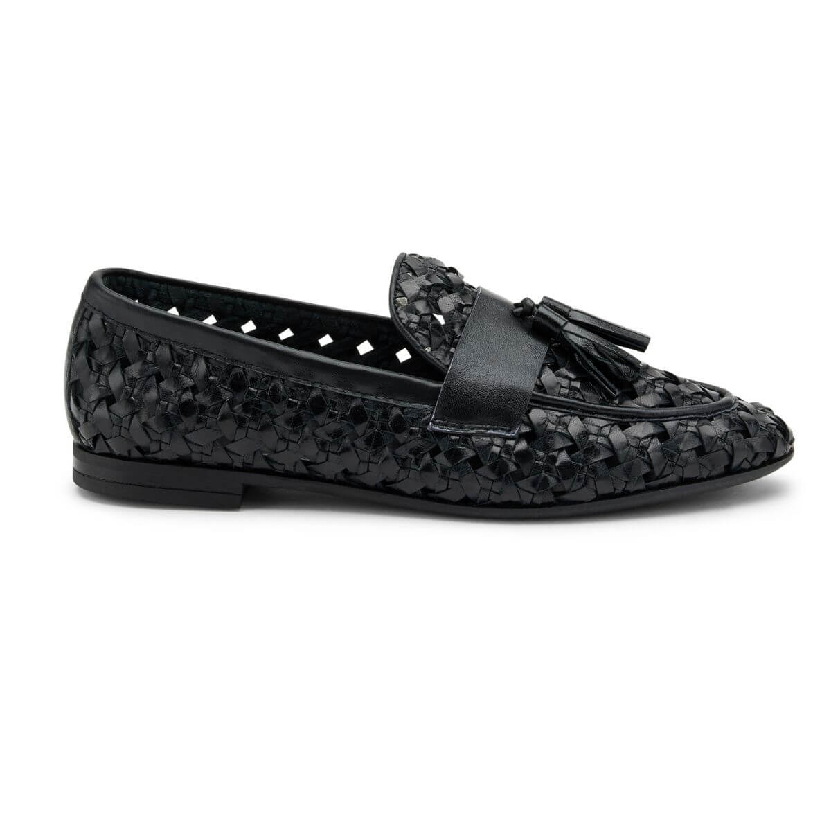Mocassino da donna di FRAU, realizzato in pelle intrecciata e forata nero con nappine. Interno e sottopiede sfoderato in pelle. Suola in gomma. Presente nel guardaroba estivo da generazioni il mocassino è un evergreen sinonimo di eleganza.