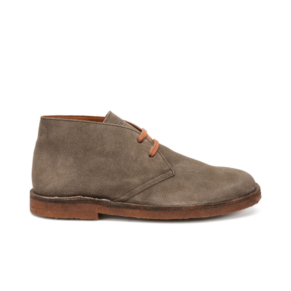 Polacchino di FRAU in pelle scamosciata di colore grigio "visone" con suola crépe. Tomaia e sottopiede in pelle con suoletta estraibile. Lacci di cotone arancioni e in dotazione anche un paio tono su tono.