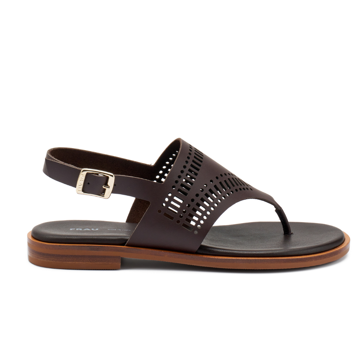 Sandalo infradito da donna di FRAU. Tomaia realizzata in morbida pelle con motivo laserato. Cinghietta in tono di chiusura regolabile. Plantare in morbida pelle. Suola in gomma.