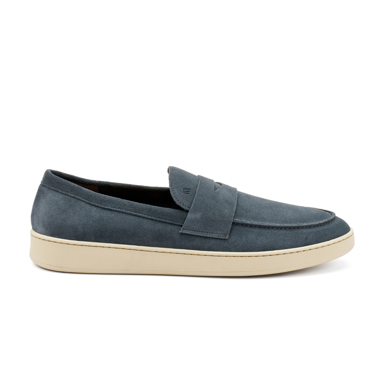 Slip-on da uomo di FRAU, simil mocassino. Tomaia realizzata in morbida pelle scamosciata avio. Sottopiede estraibile con fodera sintetica e suola a cassetta in gomma.