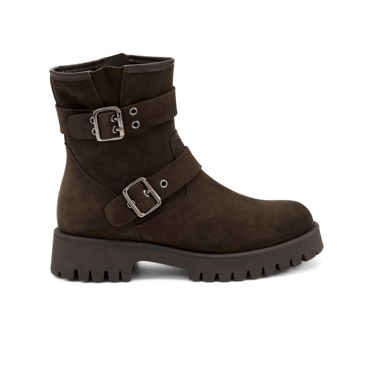 Stivaletto da donna di FRAU realizzato in pelle nabuk color testa di moro, con fibbie decorative. Interno foderato in tessuto e pelle e sottopiede non estraibile. Chiusura con zip interna. Suola in gomma carrarmato.