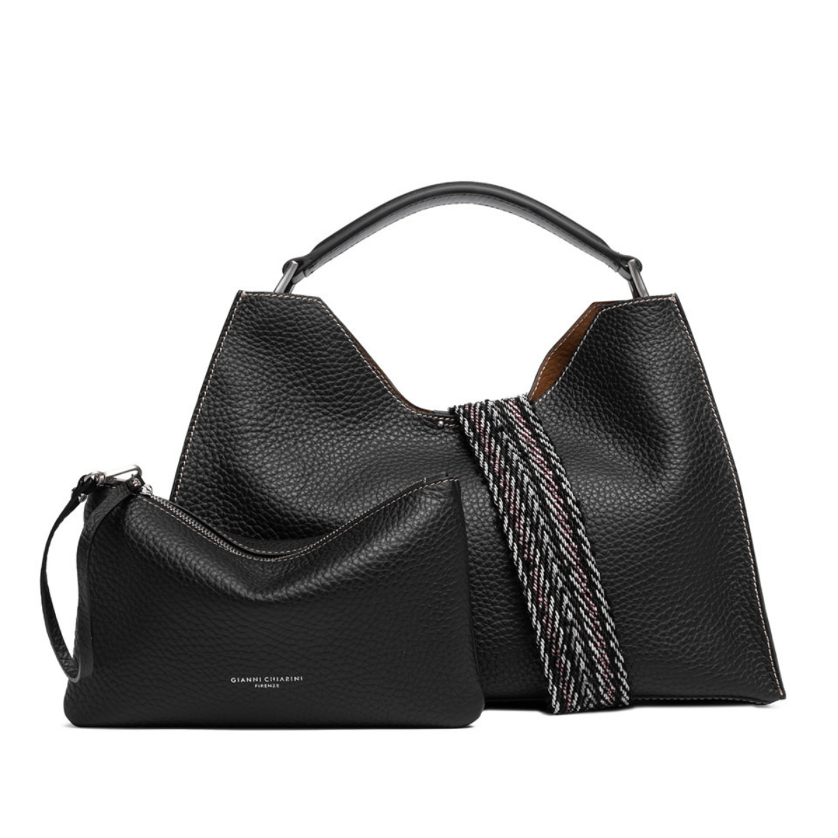 AURORA di GIANNI CHIARINI si caratterizzata per una forma trapezoidale. Sinonimo di eleganza contemporanea, è realizzata in pelle double grana maxi ed arricchita da dettagli in metallo. Dotata di una pratica tracolla regolabile e removibile, per una doppia portabilità. Presenta inoltre una chiusura superiore con magnete e una pratica bustina in tono.