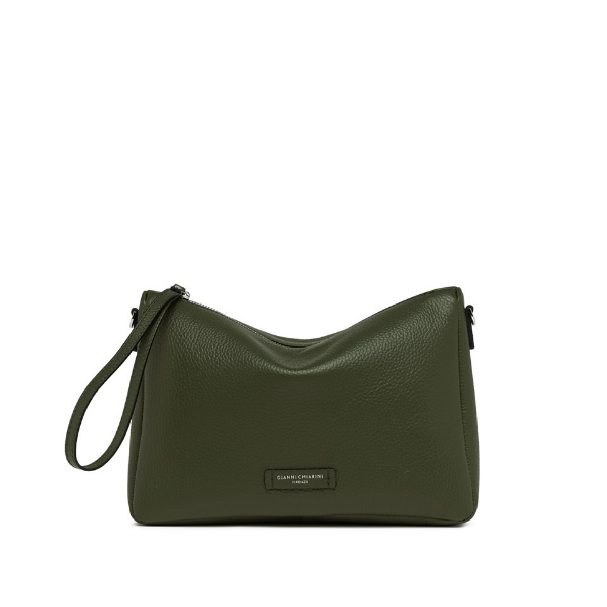 NORA POUCH di GIANNI CHIARINI FIRENZE è realizzata in pregiata pelle martellata color verde militare. È caratterizzata da un elegante cinturino in pelle per portarla al polso e da una tracolla in pelle regolabile e removibile. La chiusura è pratica e sicura con zip.