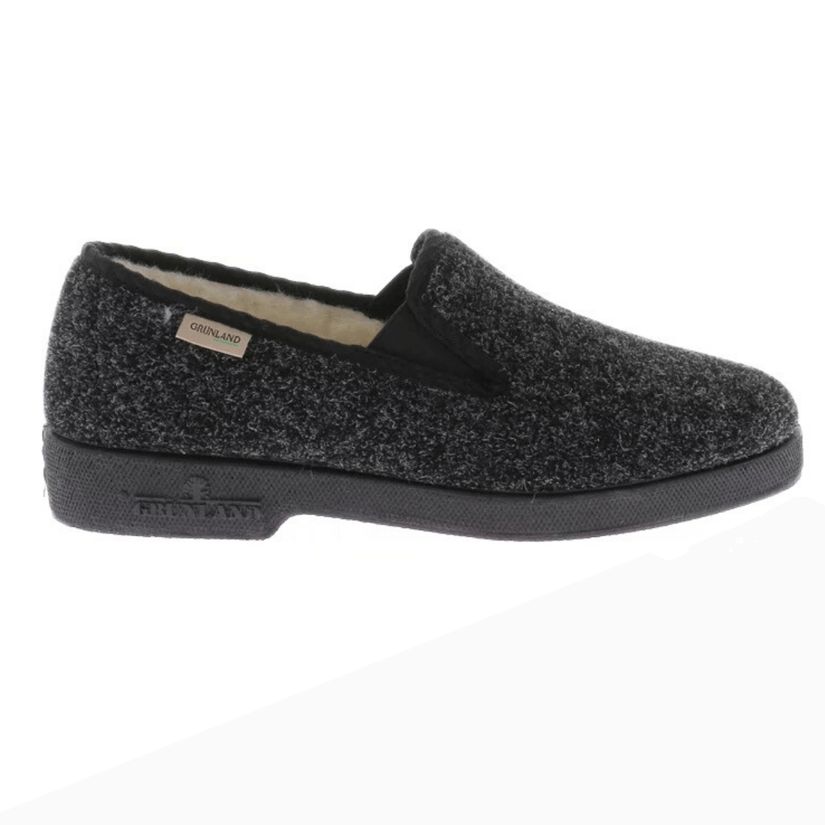 Ciabatta da uomo di GRÜNLAND realizzata in tessuto di lana cotta nero con elastici bilaterali. Interno e sottopiede in tessuto morbido bianco. Suola in gomma.