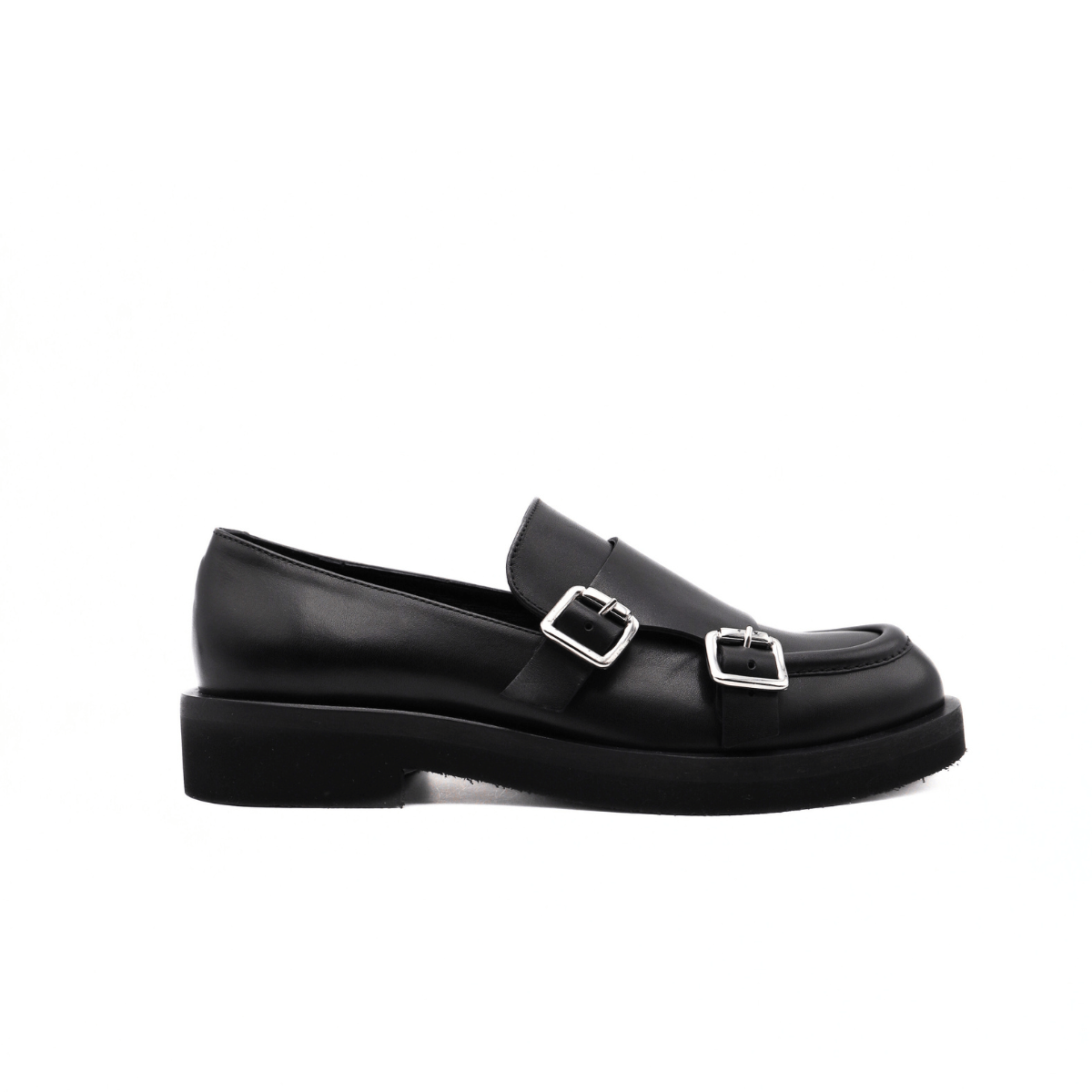 Mocassino da donna di GUGLIELMO ROTTA realizzato in pelle nera con doppia fibbia di chiusura. Interno e sottopiede, non estraibile, foderati in pelle. Suola in gomma. Prodotto ideato, disegnato e realizzato in Italia, calzatura made in Italy.