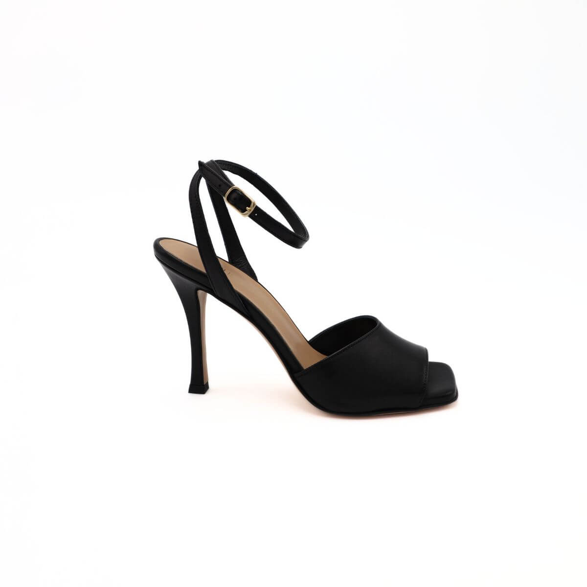 Sandalo da donna di GUGLIELMO ROTTA, realizzato in pelle nera con fascia chiusura con cinturino attorno alla caviglia. Interno e sottopiede rivestito in pelle. Suola in cuoio e tacco rivestito in pelle 10 cm.