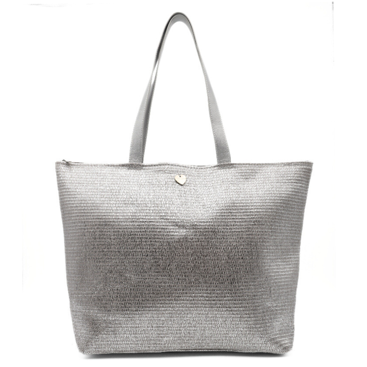 Borsa a spalla di HAT YOU realizzata in tessuto laminato argento, interno con unico comparto e chiusura con zip.