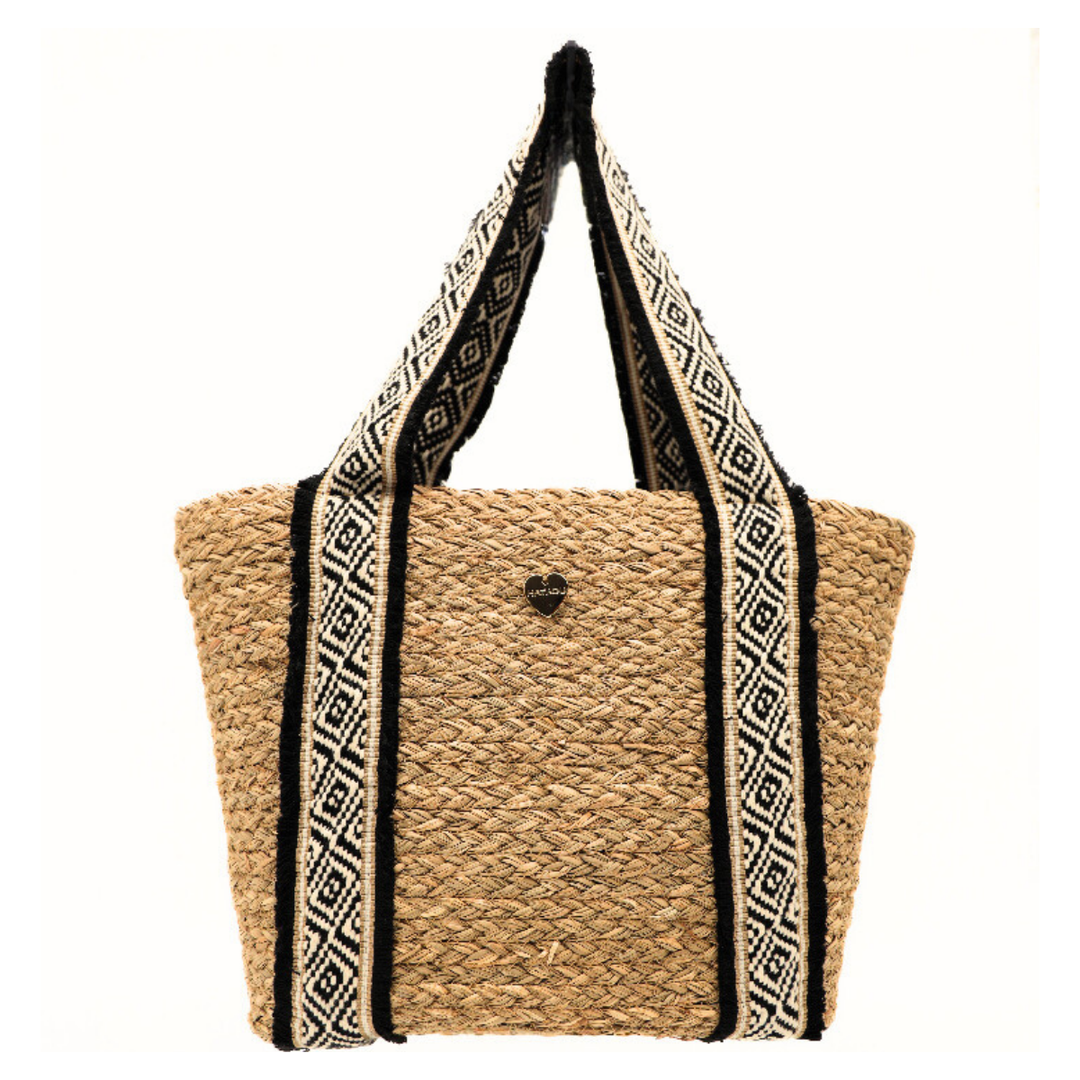Borsa a spalla di HAT YOU realizzata in raffia beige con manici in tessuto bianco e nero, interno con unico comparto e chiusura con laccio.