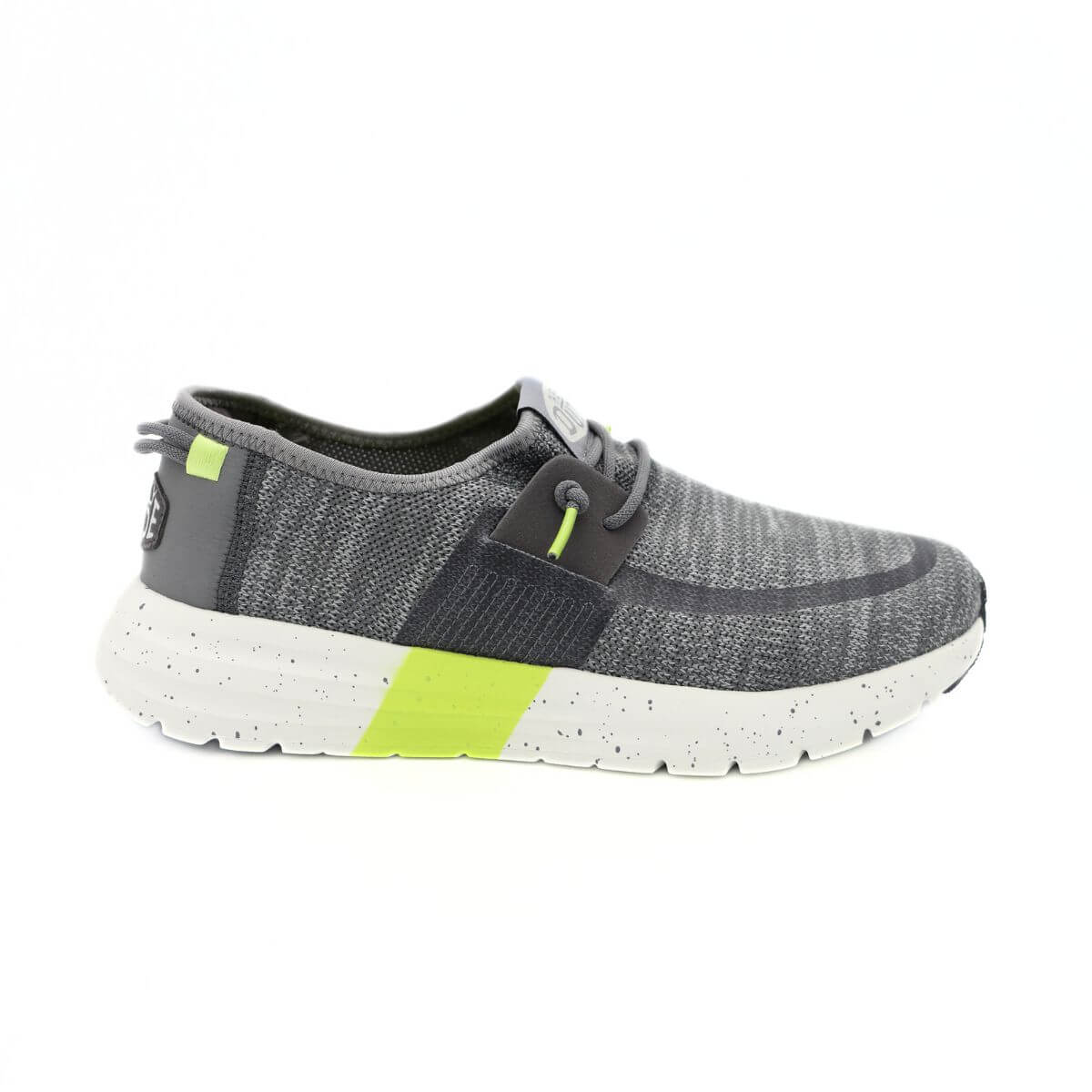 Scarpa sportiva da uomo di HEY DUDE, realiazzata con una tomaia in mesh traspirante color grigio scuro. Calzata easy-on con lacci elastici. Interno in tessuto e plantare estraibile in morbidissima schiuma. Suola in gomma ultra leggera. La linea Sirocco Sport Stripe unisce funzionalità e stile, ideale per qualsiasi occasione.