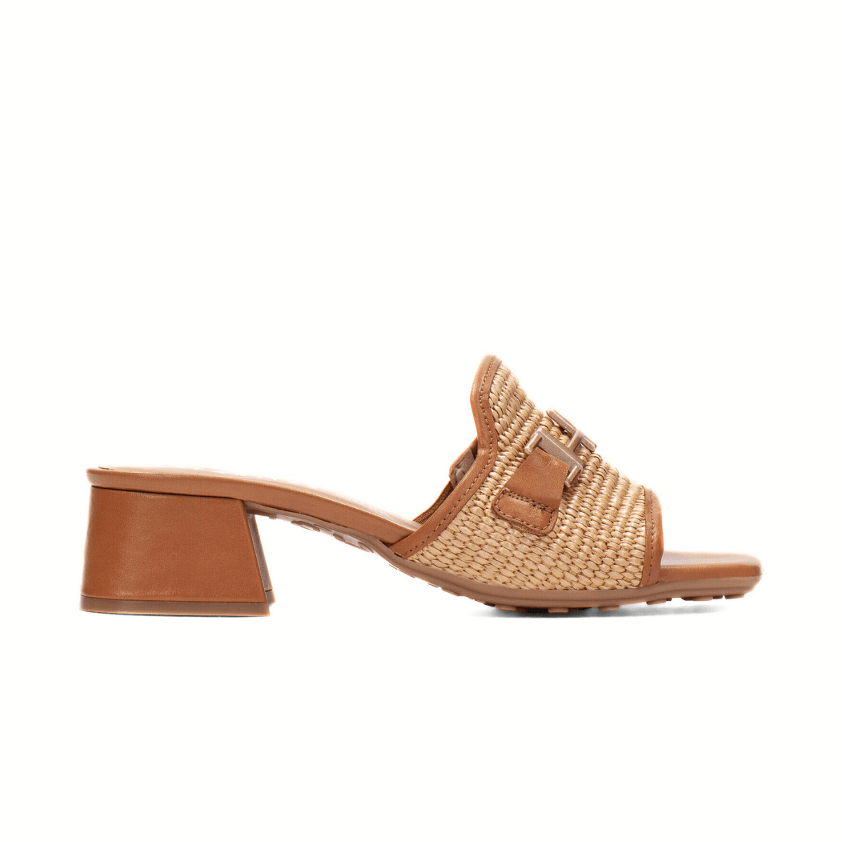 Sandalo da donna di HISPANITAS. Realizzato con una tomaia in tessuto rafia color cuoio e decoro logo oro. Sottopiede in pelle, suola in gomma e tacco liscio (altezza: 4cm).