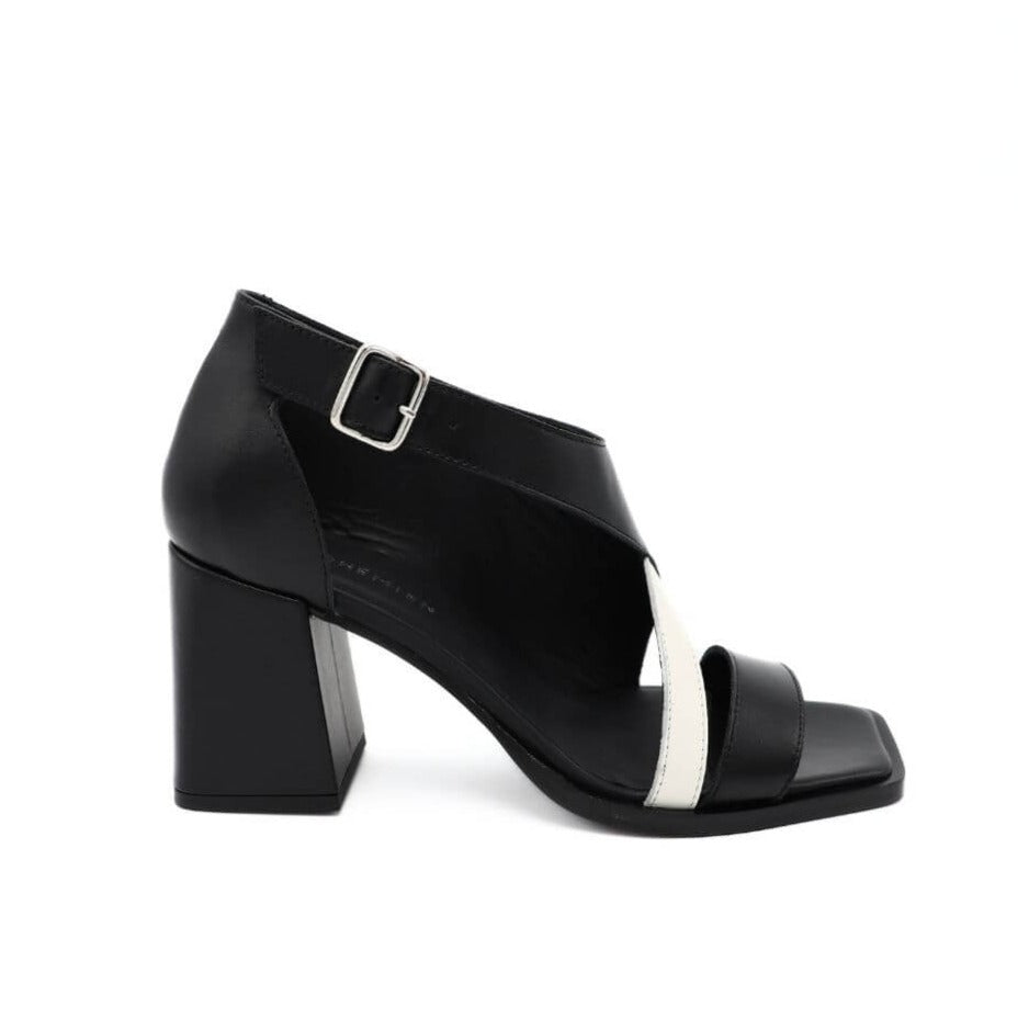 Elegante sandalo alto da donna di LE BOHÉMIEN. Tomaia realizzata in pelle nera e bianca, chiusura con cinturino alla caviglia. Foderato internamente in pelle. Suola in cuoio. Resa unica dalla sua particolare tomaia aperta la rende perfetta per la nuova stagione. Altezza tacco: 8cm