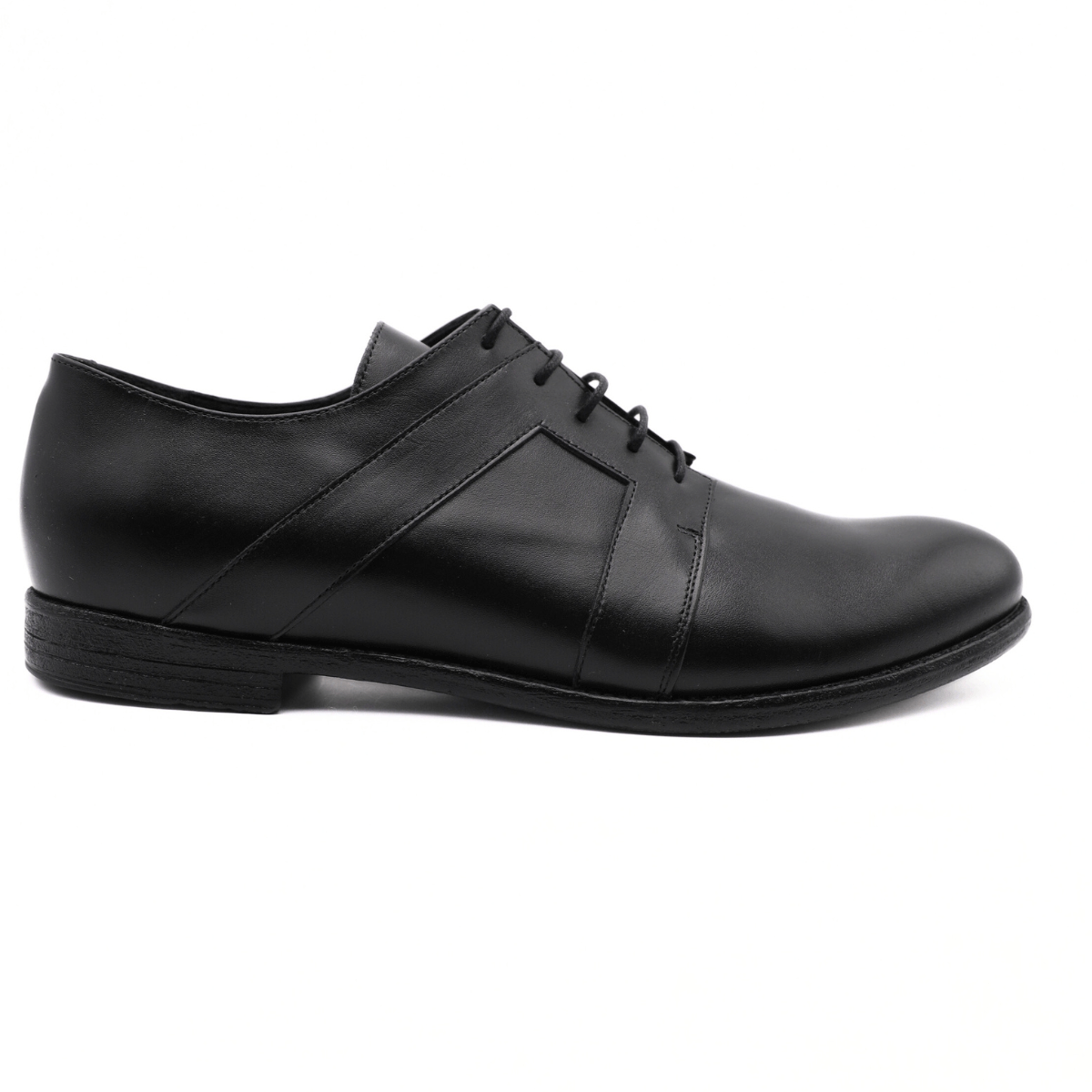 Scarpa, elegante, stringata da uomo di LE BOHÈMIEN. Tomaia realizzata in pelle nera, con cuciture a vista sui lati. Interno foderato e sottopiede in pelle. Suola in cuoio. Chiusura con laccio fino.