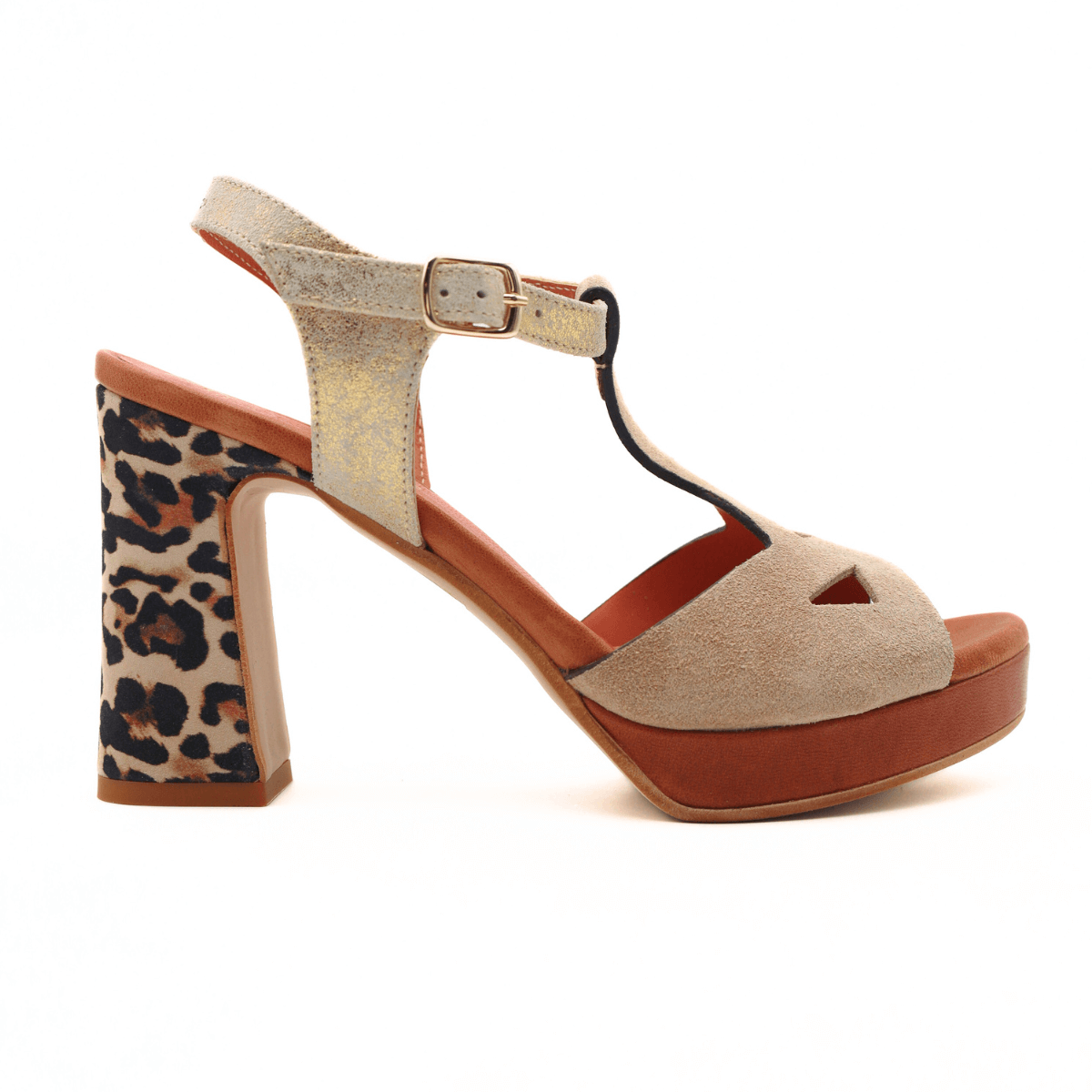 Sandalo da donna con tacco di LES: VENUES, realizzato in pelle scamosciata beige, tacco leopardato e cinturino in pelle scamosciata in inserti oro. Interno e sottopiede, non estraibile, foderati in pelle. Chiusura con cinturino regolabile. Suola in gomma effetto cuoio.
