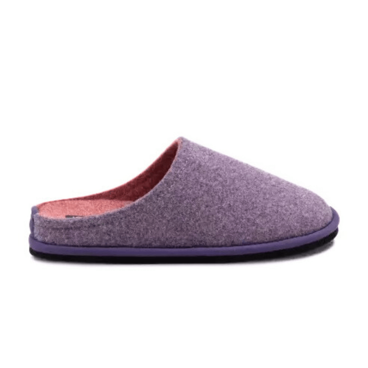 Ciabatta da donna di LÖWENWEISS modello EASY BICOLOR. Tomaia realizzata in feltro di lana color lilla e interno rosso. Plantare estraibile rivestito in morbido feltro. Suola lavorata a mano in feltro e lattice naturale.