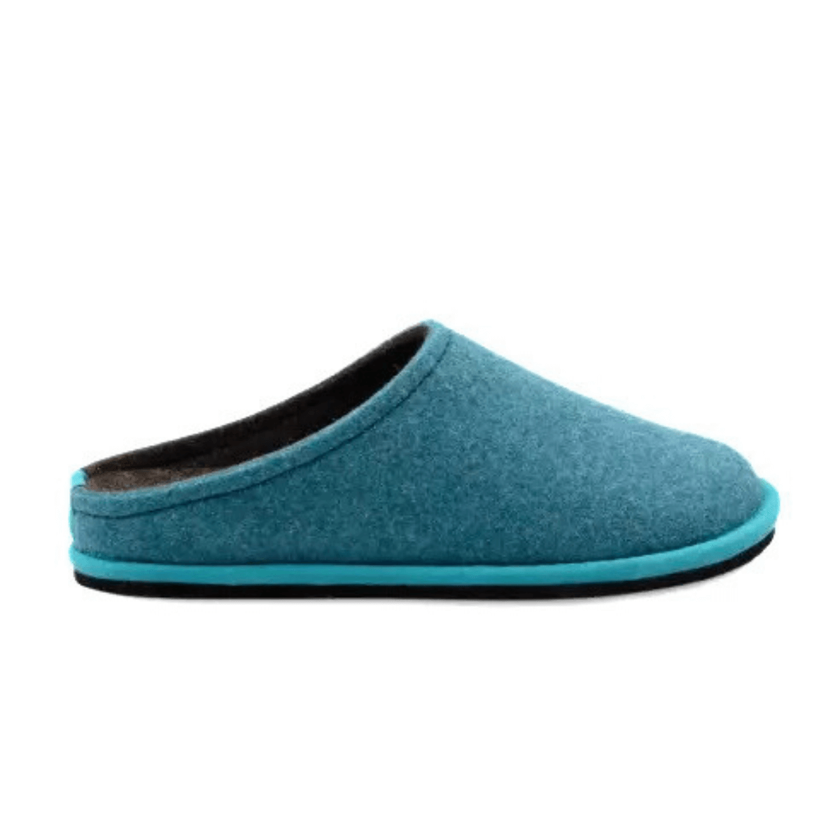 Ciabatta unisex di LÖWENWEISS modello EASY BICOLOR. Tomaia realizzata in feltro di lana color turchese e interno marrone. Plantare estraibile rivestito in morbido feltro. Suola lavorata a mano in feltro e lattice naturale.