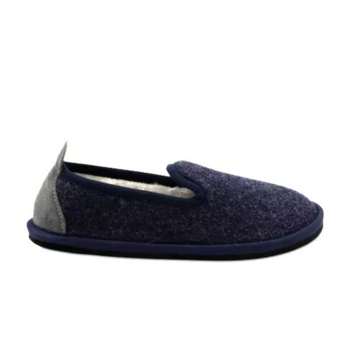 Pantofola uomo di LÖWENWEISS modello Pal. Tomaia realizzata in feltro di lana colore blu con tallone grigio. Plantare interno rivestito in morbido feltro. Suola lavorata a mano in feltro e lattice naturale.