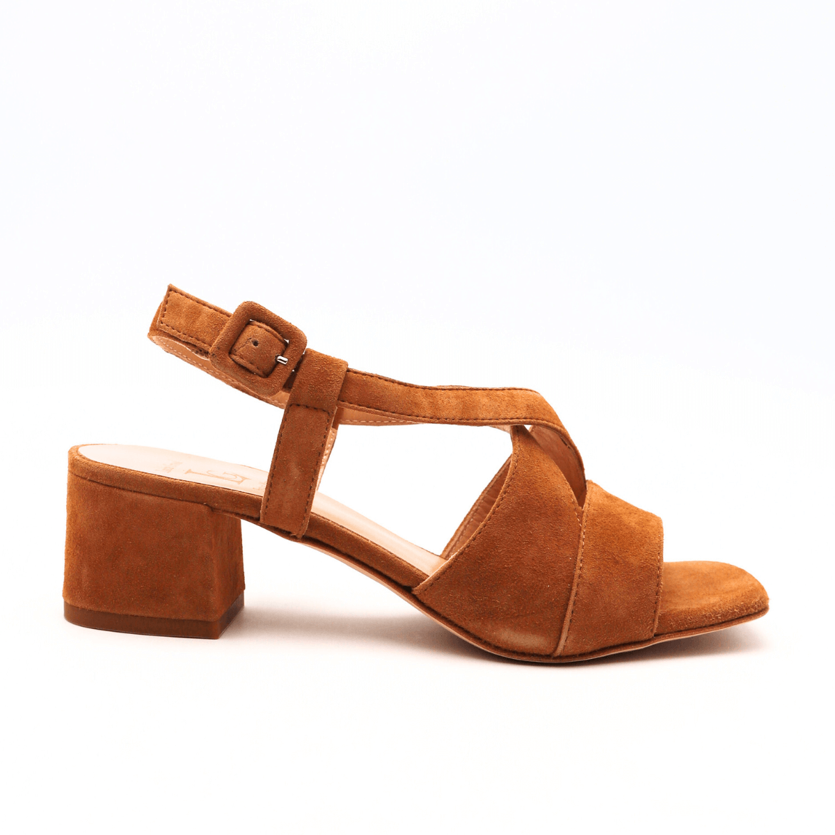 Sandalo da donna di LUCA GROSSI, realizzato in pelle scamosciata cuoio con fascia ed incrocio. Interno e sottopiede, non estraibile, foderato in pelle. Chiusura con cinturino regolabile. Suola in cuoio, tacco rivestito in camoscio.