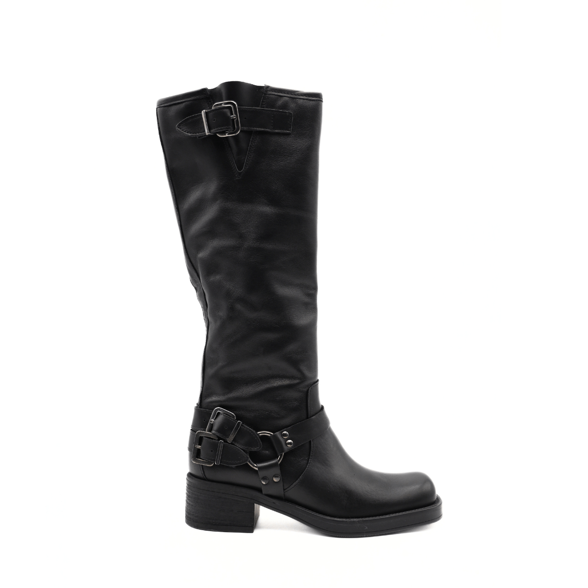 Stivale alto, anfibio, da donna di MAD MIND. Realizzato in pelle nera con fibbie sul gambale e sulla caviglia. Suola in gomma.