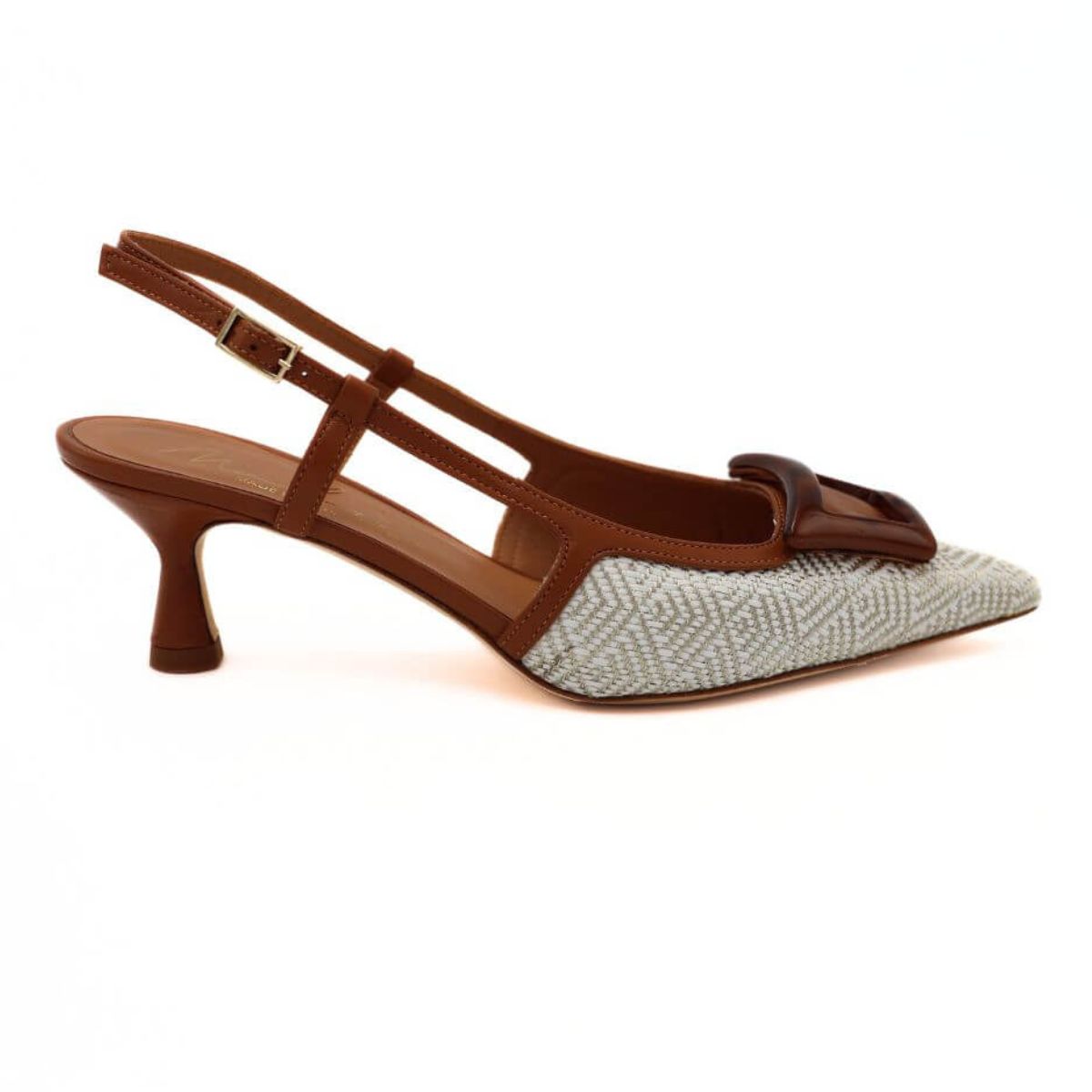 Indossa l'ultima tendenza della moda con le slingback di MALÙ. Queste eleganti scarpe realizzate in pelle color cuoio con inserti intrecciati bianchi e oro, e accessorio decorativo. Interno e soletta in morbida pelle. Un design sofisticato con una suola in cuoio per un comfort duraturo.