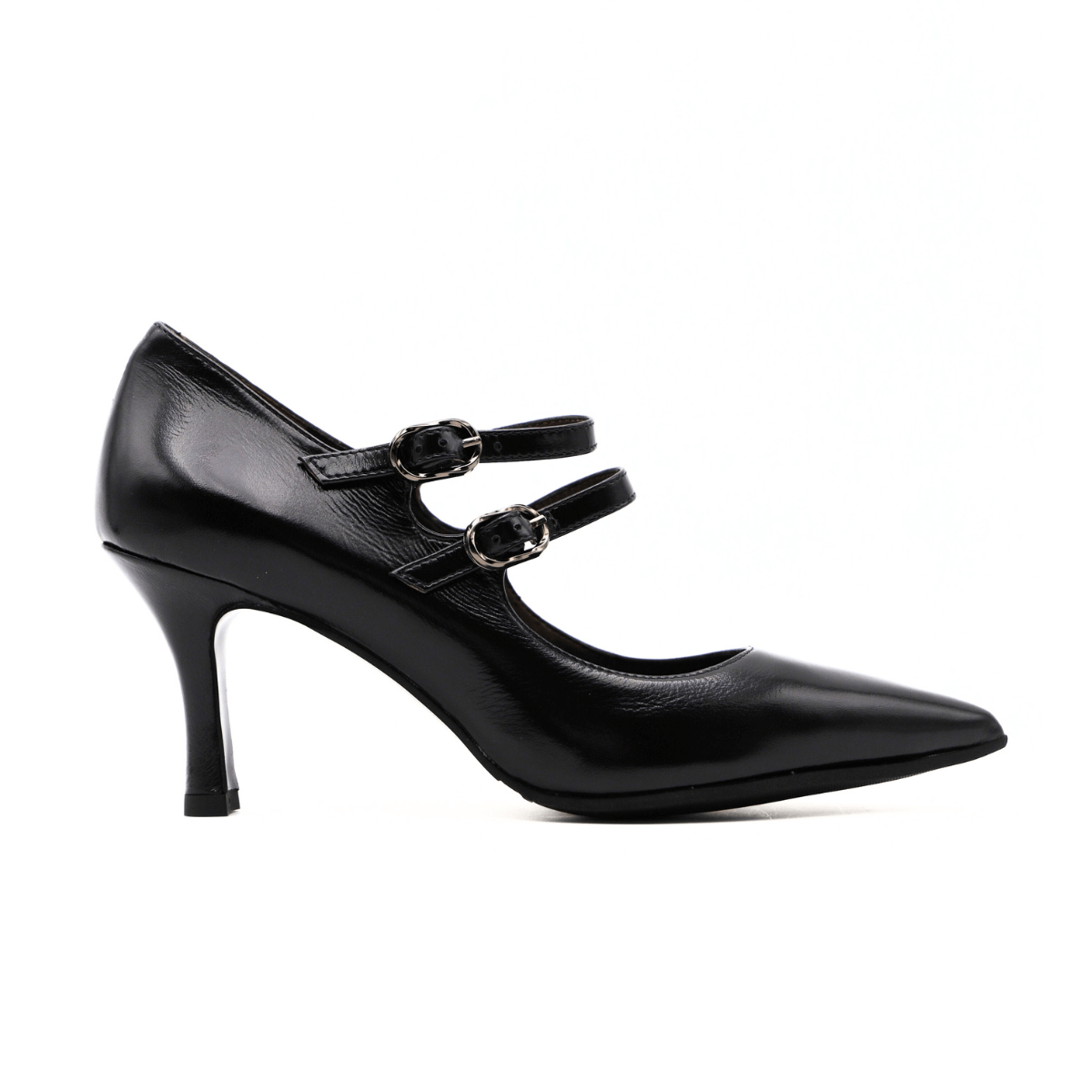 Décolleté da donna di MALÙ realizzata in pelle naplack nera con due fibbie. Interno e sottopiede foderati in pelle. Suola in gomma.